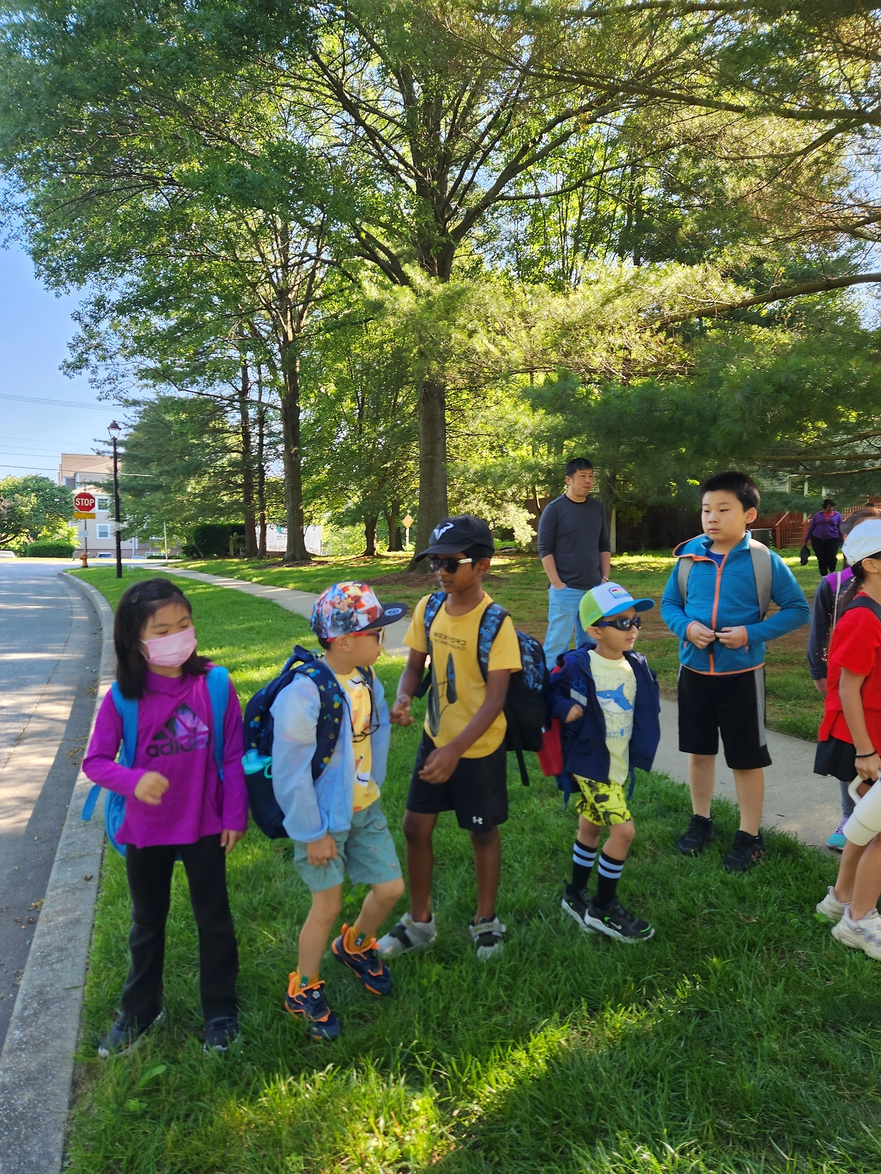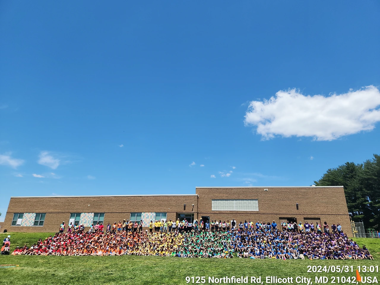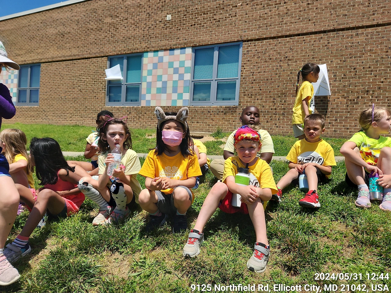 스쿨버스가 가고 나서 옐로 티와 반바지를 들고가서 학교오피스에 맡겼다. 집에 와서 오전에 할 일을 마치고 12시 반에 다시 학교로 돌아갔다. 캠핑의자와 아이스커피도 챙기고 나섰다. 첫 필드데이라 사진을 찍어주고 싶었다. 아이들은 학년별로 빨강은 3학년, 주황, 노랑은 킨더 초록은 1학년, 파랑, 보라색은 2학년 무지개색을 나란히 입고 갔다.