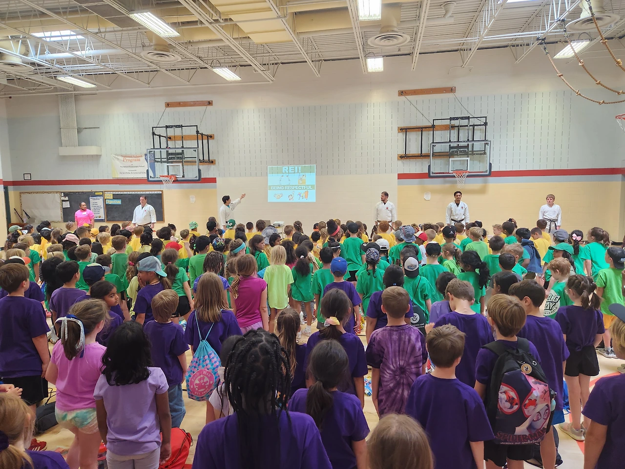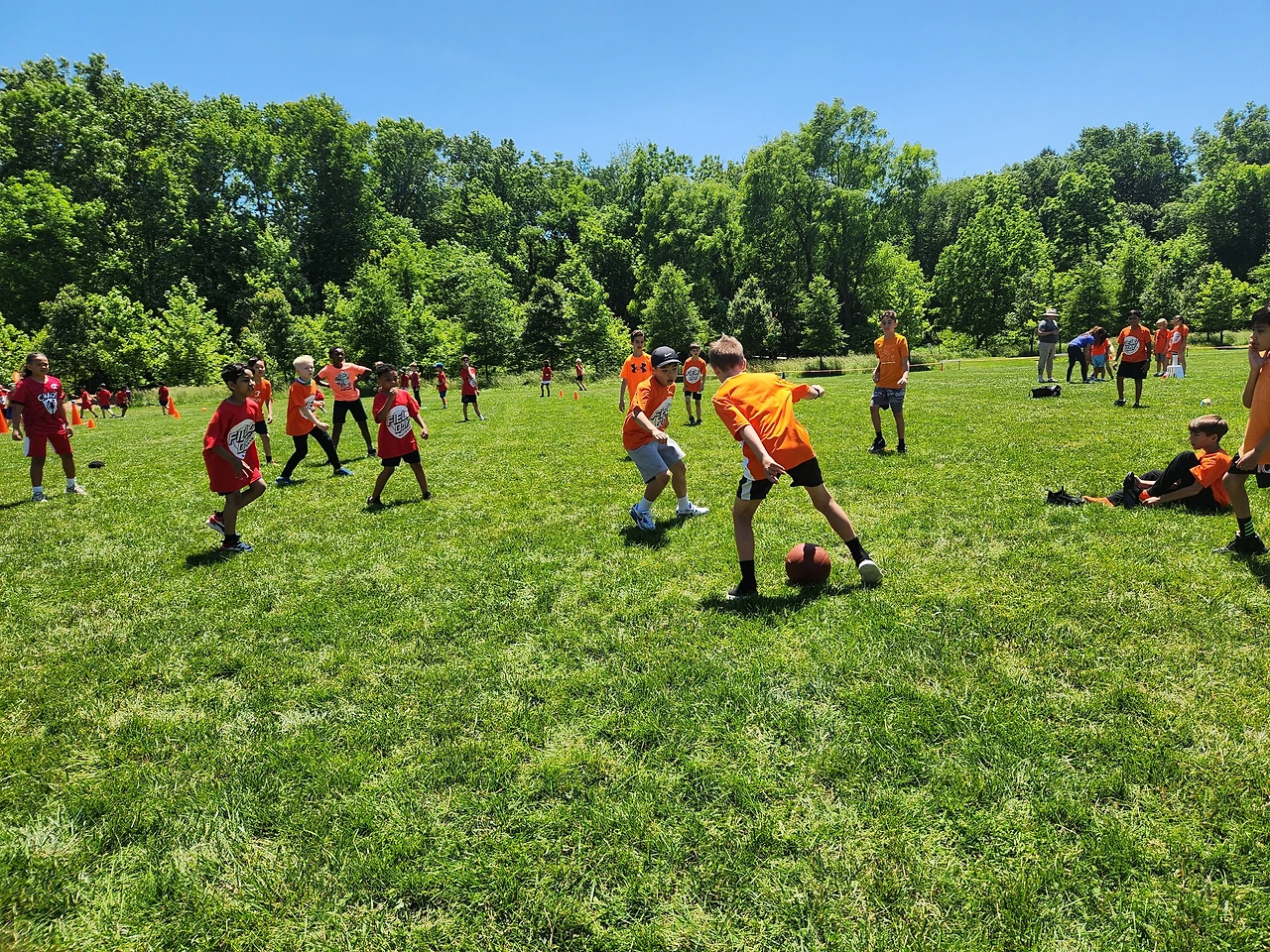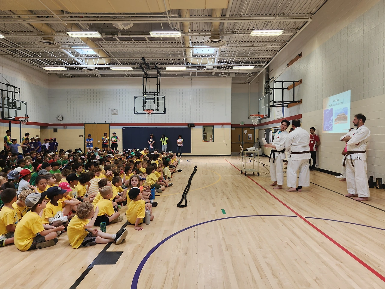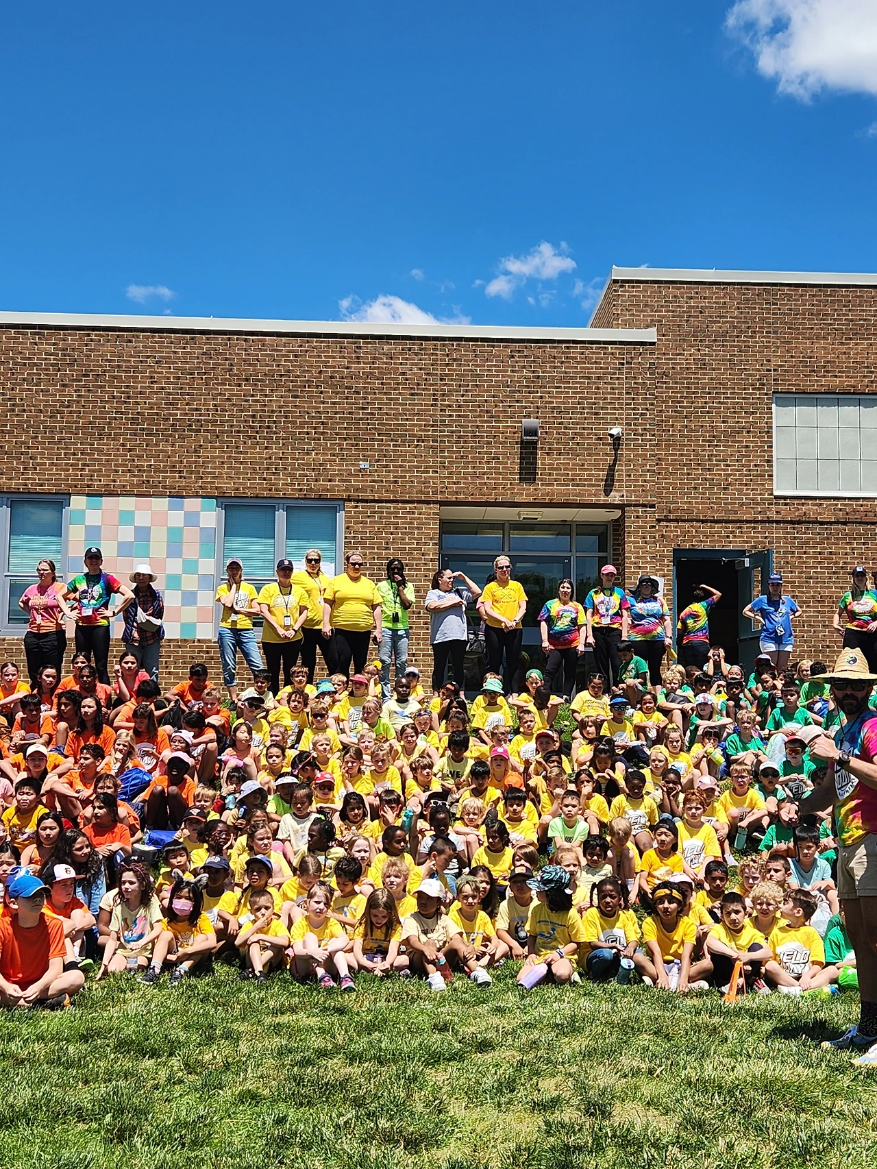 스쿨버스가 가고 나서 옐로 티와 반바지를 들고가서 학교오피스에 맡겼다. 집에 와서 오전에 할 일을 마치고 12시 반에 다시 학교로 돌아갔다. 캠핑의자와 아이스커피도 챙기고 나섰다. 첫 필드데이라 사진을 찍어주고 싶었다. 아이들은 학년별로 빨강은 3학년, 주황, 노랑은 킨더 초록은 1학년, 파랑, 보라색은 2학년 무지개색을 나란히 입고 갔다.