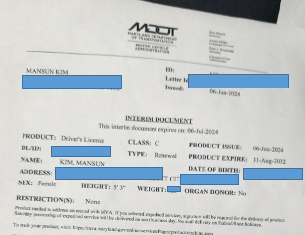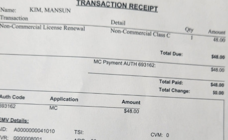 면허장에 도착하면 체크인을 해야 한다. 바코드를 인식하고 내가 예약한 confirmation 번호를 넣으면, 전광판에 나의 체크인티켓번호ㅡG914ㅡ가 올라간다. 3분도 안되어서 바로 call이 와서 아주 순식간에 일처리를 했다. 영주권이 있냐고 하길래? 영주권과 SSN 카드를 보여줬고, 거주증빙용 우편물은 달라고 하지 않았다. 또한 시력검사를 한다. 4개의 라인에 있는 것을 읽어보라고 한다. 두 번째 라인을 읽어보세요, 네 번째 라인을 읽어보세요. 그리고 불빛 반응검사도 한다. 파란색 스티커를 보고 불빛이 나는 쪽을 보지 말고 손으로 대충 어디쯤인지 표시를 하라는 것이다. 그렇게 왼쪽과 오른쪽을 번갈아 하고 나서 사진을 찍는다.