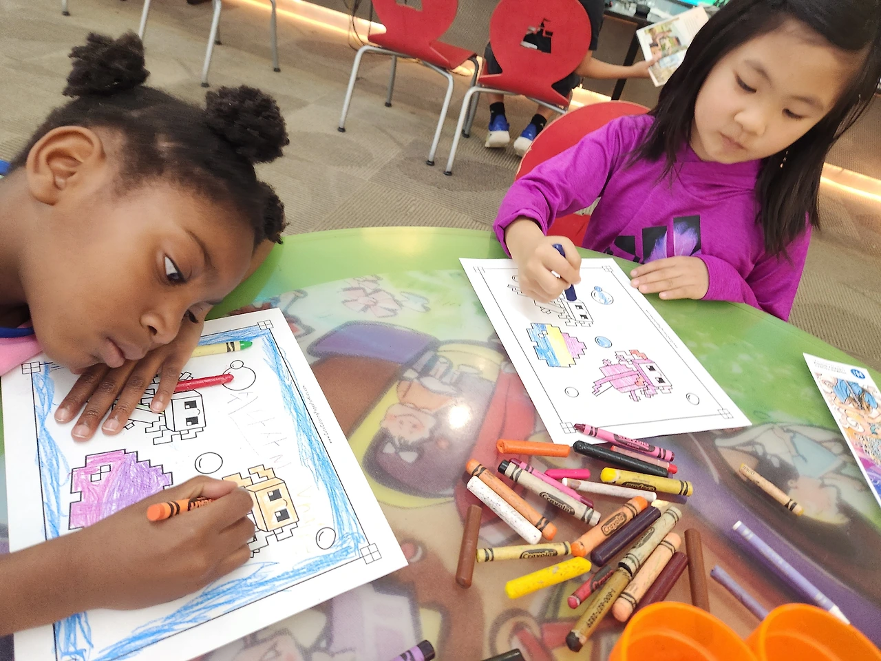 미국도서관에 오자마자 색칠놀이로 시작한다. 밑그림이 매번 바뀌므로 아이들이 참 좋아한다. 이게 끝나면 컴퓨터로 게임도 한다. 그러고 한참 뛰며 돌아다니다 마지막에 책을 본다.