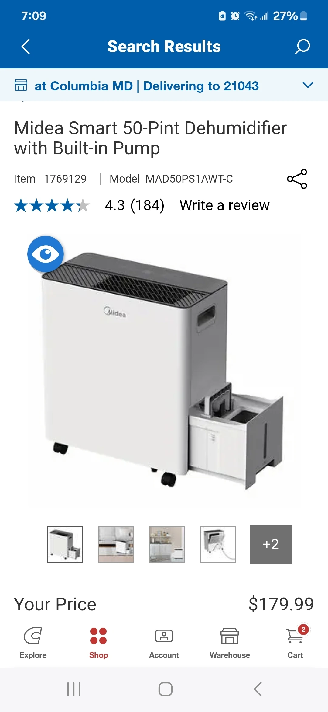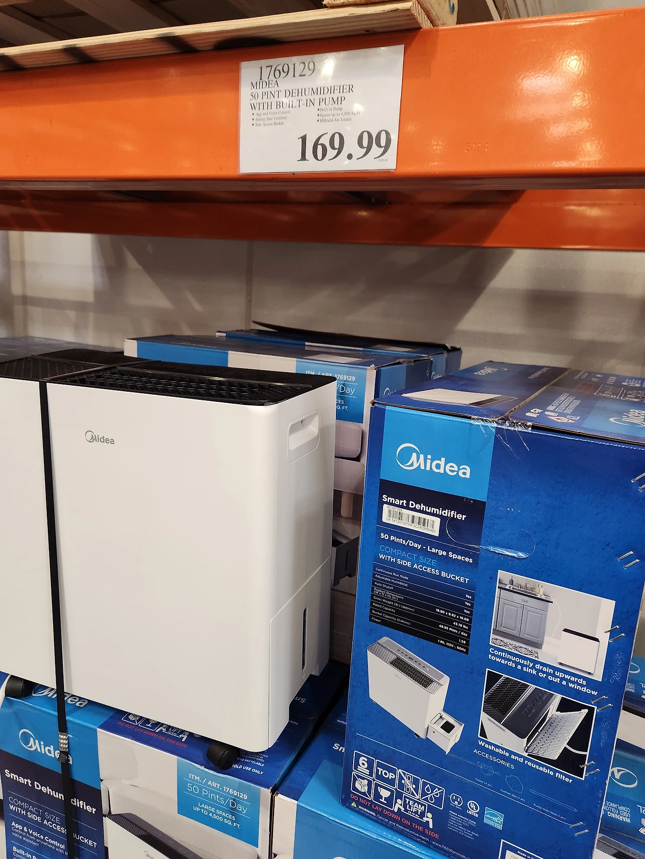 그래도 지하에 내려가면 눅눅한 기분이 들어서 제습기를 아마존에서 구매했다. 작은 기기가 소리도 크고 물도 잘 못 빨아들이는듯하여 리턴하고 코스트코로 갔다. 큰 사이즈로 사야 한다고 주변에서 조언을 해줬는데 파는 상품이 중국의 메이디라는 회사의 상품 딱 하나가 있었다. 50 pint라고. 적혀있었고 이것은 28.4리터 정도가 된다. 170불 정도 했고 혼자 데리고 오기에는 무척 무거웠다.