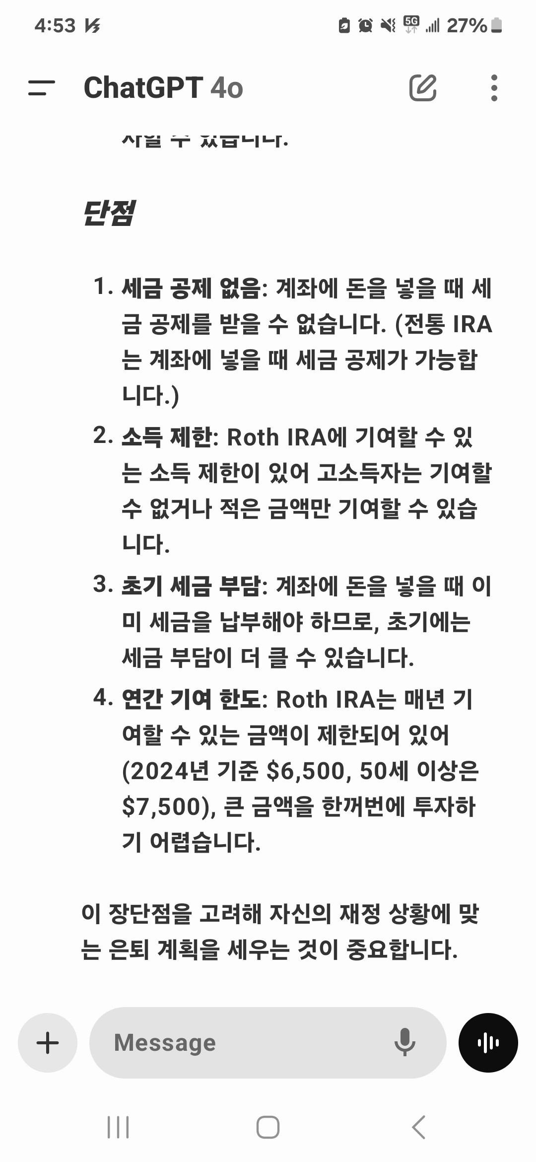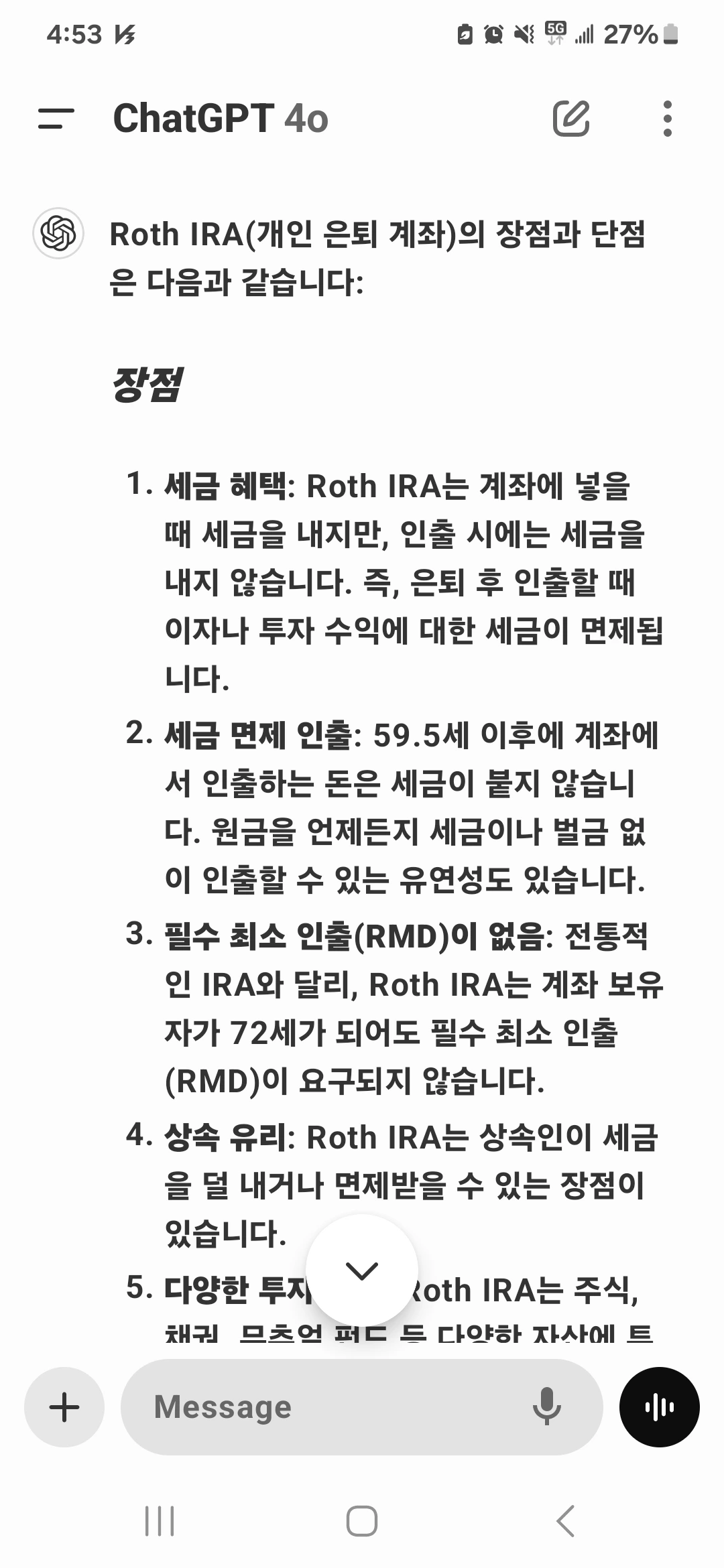 주의: 연금상품이므로 59.5세가 넘어야 페널티 없이 뺄 수 있다. 또한 기존연금은 73세에 RMD라고 최소 인출 금액이 있는데, ROTH는 RMD가 없다.