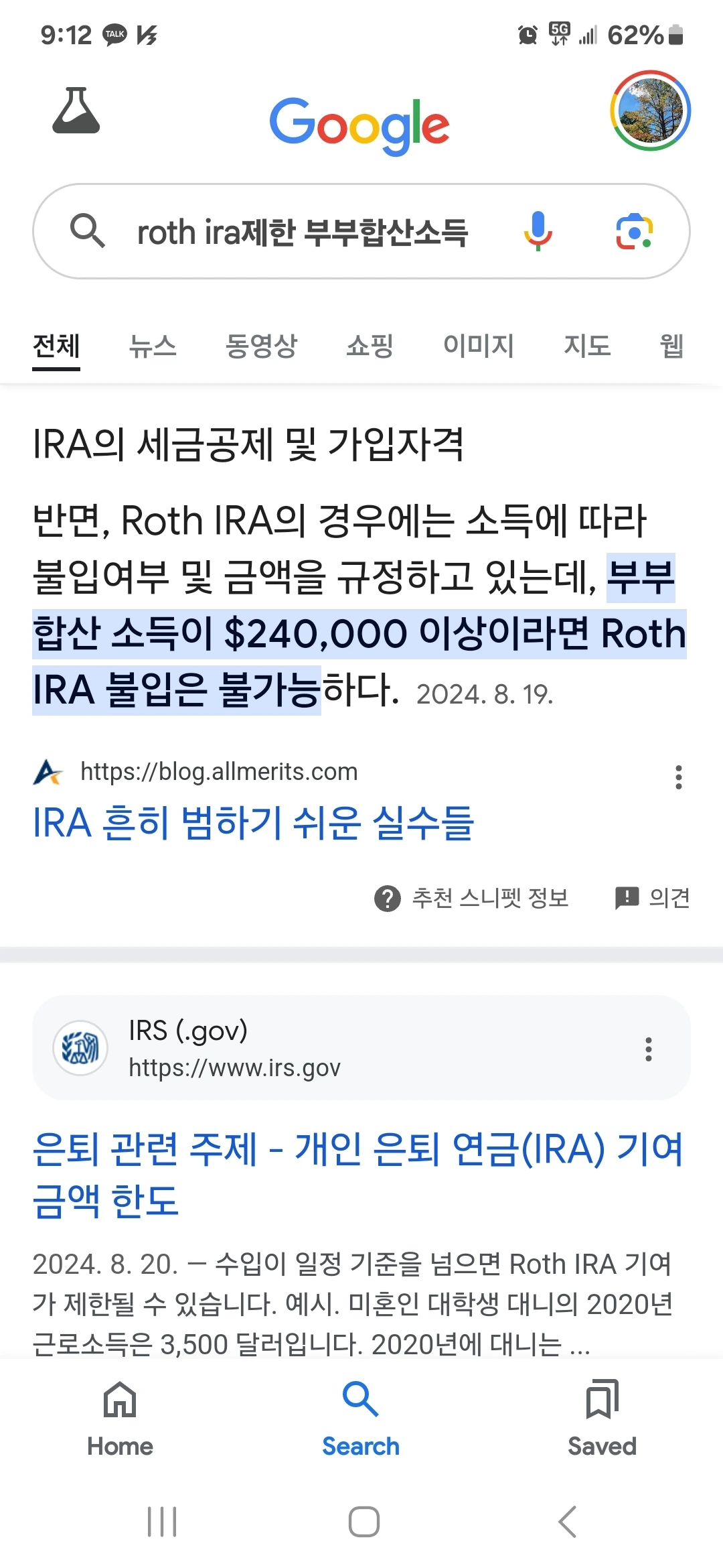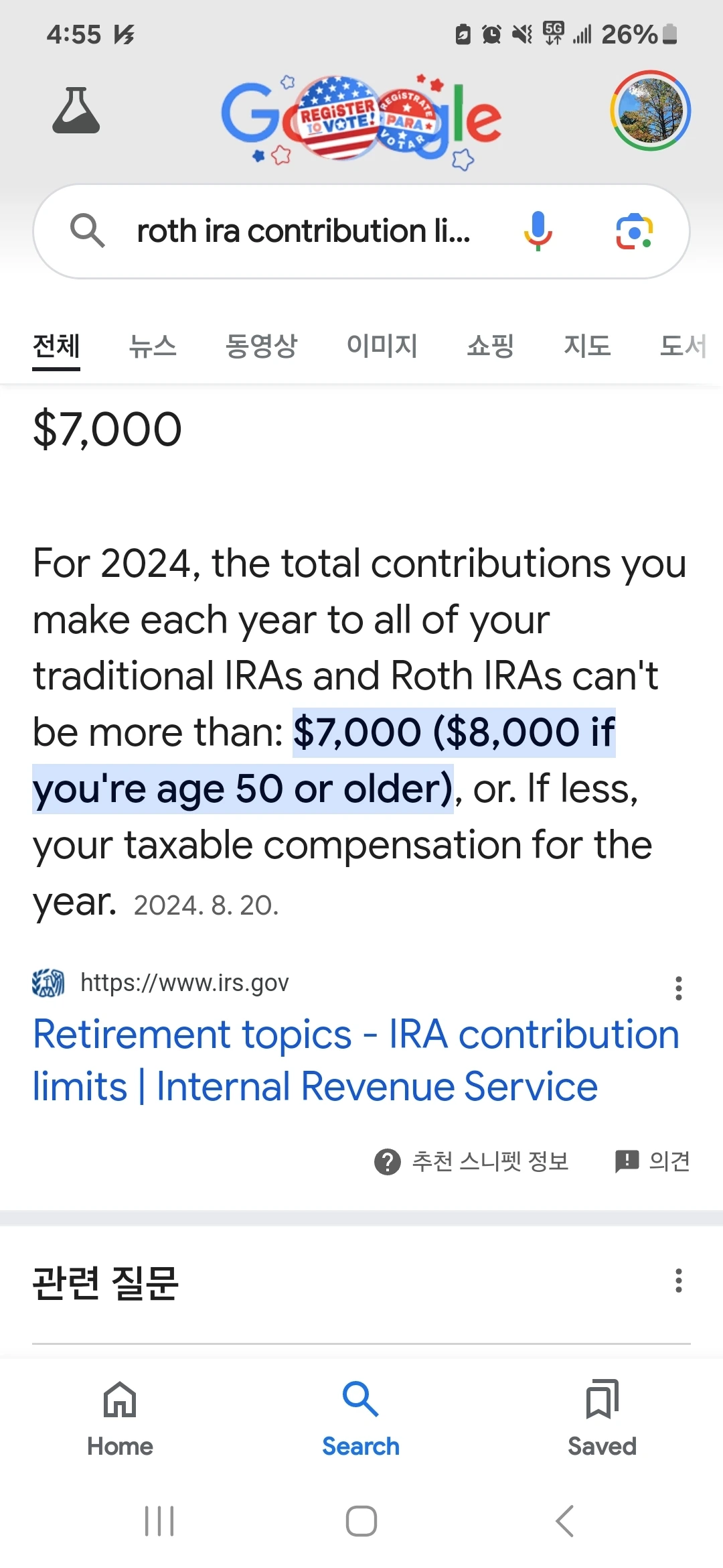 ROTH 최대한도- 구굴에 ROTH IRA CONTRIBUTION 2024라고 검색하면 결과가 나온다. 연도별로 그 금액이 상향되기 때문에 당해연도에 얼마인지를 확인해야 한다. 2024 기준으로 7000불이며. 50세가 넘어가면 8000불이 가능하다.