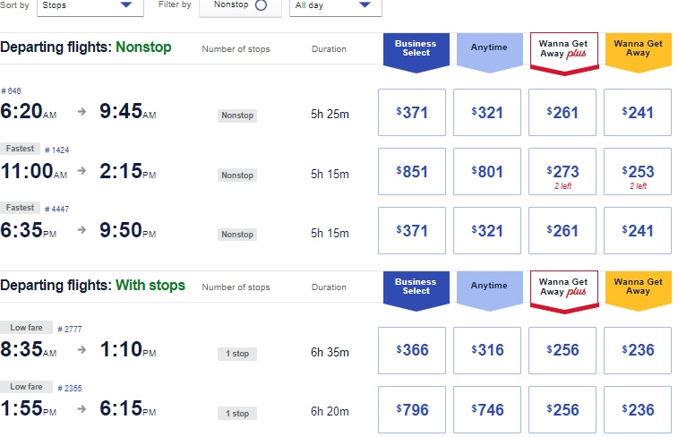 사우스웨스트항공사에 가서 BWI-PHX구간을 검색해 보면. 아래와 같은 화면이 나온다. 상단 3개의 노선은 직항이며, 아래의 두 개의 노선은 다른 곳에서 STOPOVER를 하는 항공노선을 의미한다. 오른쪽에 4개의 요금이 다르게 찍힌 부분은 제일 싼 거 노란 부분(캔슬을 하면 전액 CREDIT로 돌려준다. ) , 하얀색과 빨간색으로 된 버튼은 2/3 정도는 카드 취소해 주는데 1/3 정도는 CREDIT로 돌려준다. 이렇게 다양한 요금제가 있다.