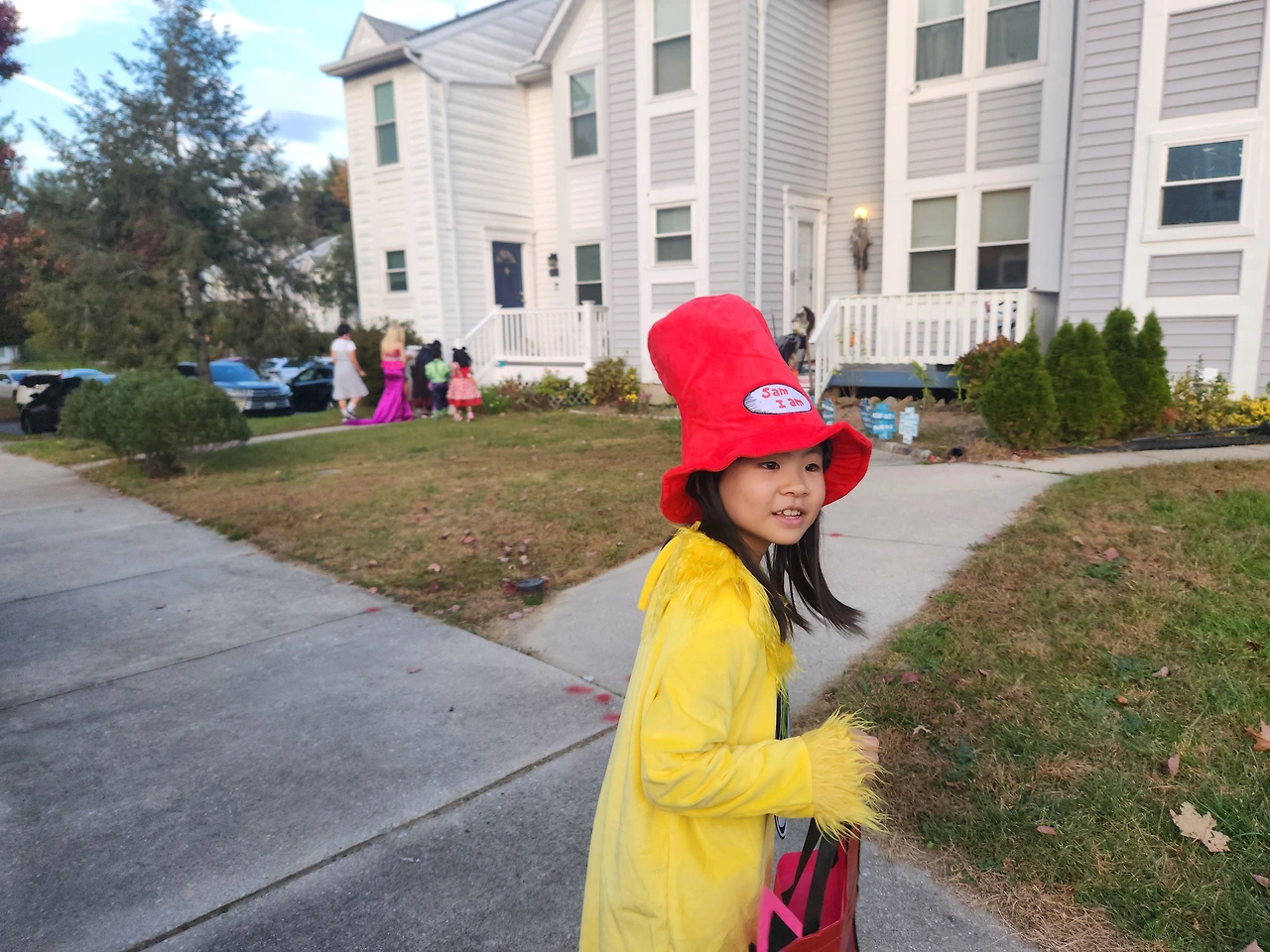 큰 아이들의 일당들은 미니언즈 복장으로 통일하여 9명이 모여졌고, 동생팀은 4명이 한 조로 움직였다. 안전을 위해 언니들 뒤를 졸졸 따라 다니게 했다. 한국에서 지난주에 온 아이는 이런 것을 처음 해봐서 그런지 무척 재미있는 눈치였고, 마녀 복장도 준비하여 입고 왔다. 우리 막둥인 sam i am 코스튬을 준비했는데, 이날 날이 더워서 모자 밑으로 땀이 흘렀다.