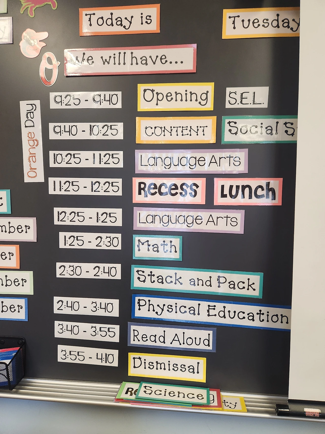 아래가 하루종일 어떻게 학교생활을 하는지에 관한 일정표이다. 3시 35분에 끝나서 집에 4시 30분에 도착하는데. 3시 55부터 4시 10분까지는 하교를 준비하는 시간인듯하다. (학교현관문은 9시15분부터 오픈)