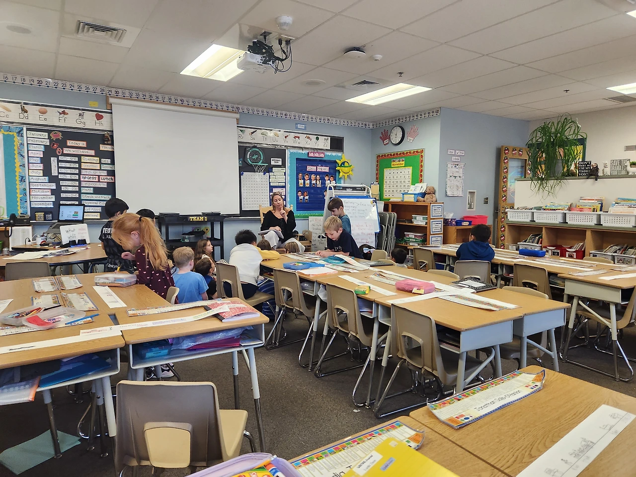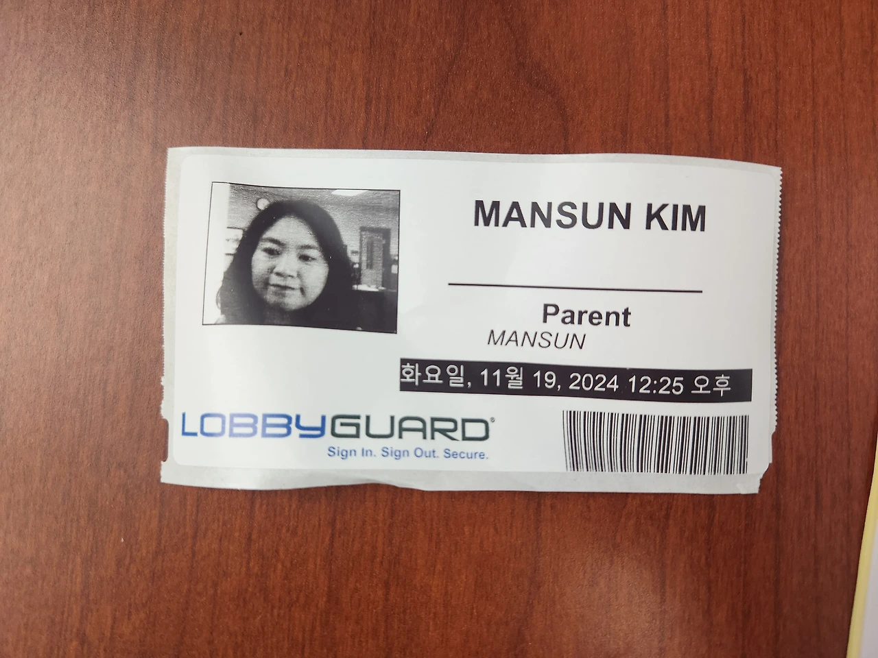 몇 주 전부터 참관수업에 관련된 이메일이 왔다. 보통 땡스기빙 연휴 전으로 1주일은 아무 때나 아이의 교실에 가서 수업하는 모습을 볼 수 있다. 평소에는 굳게 닫혀 있는 학교라서 이런 날 안 가보면 내부를 들어갈 수가 없다. 일단 오피스에 가서 어떤 기계에 신분증뒤의 바코드를 스캔하게 하고 아래와 같은 스티커를 상의에 붙이고 들어간다. 우리 아이 교실은 입구에서 가장 가까운 곳에 있다.