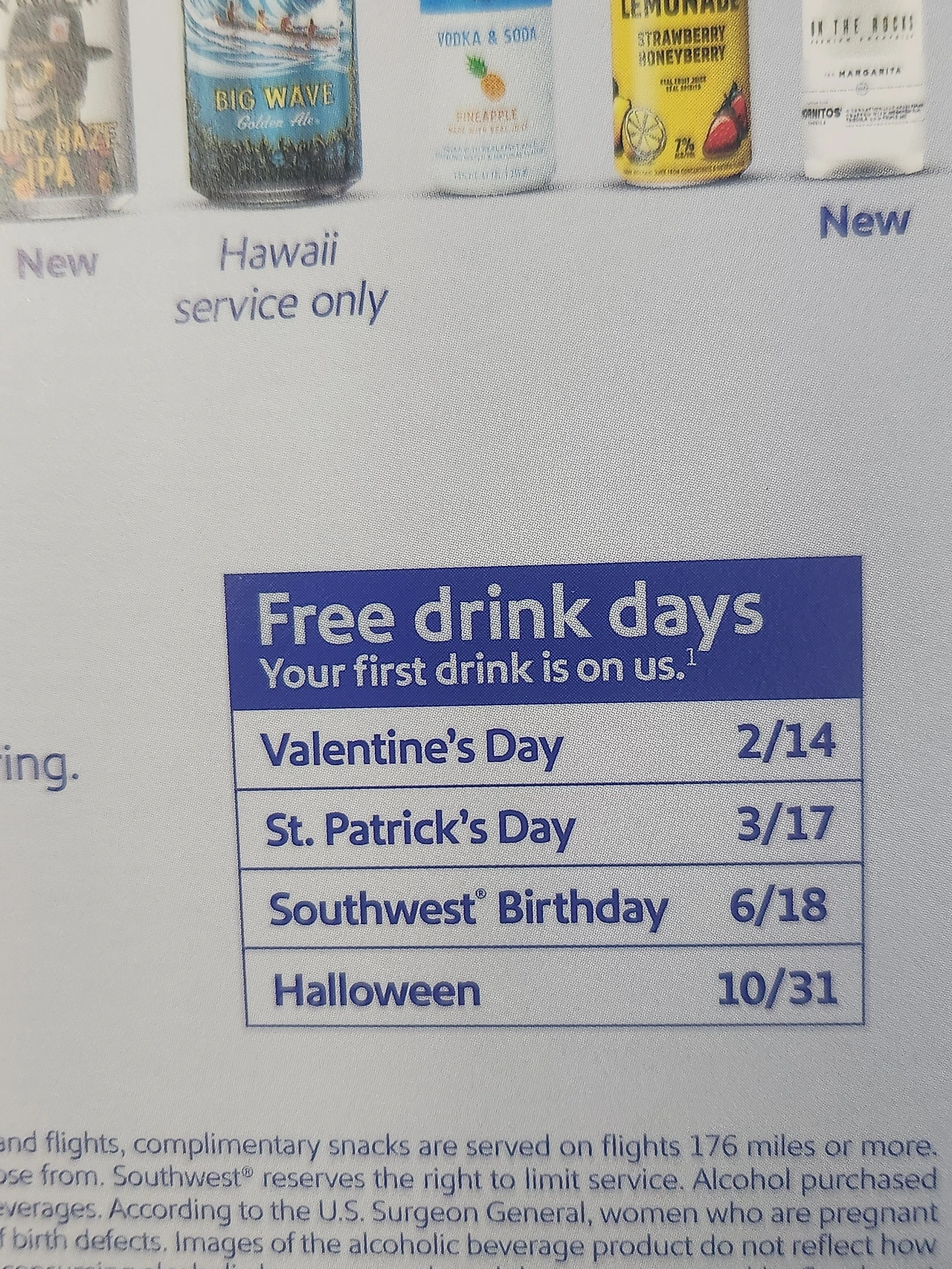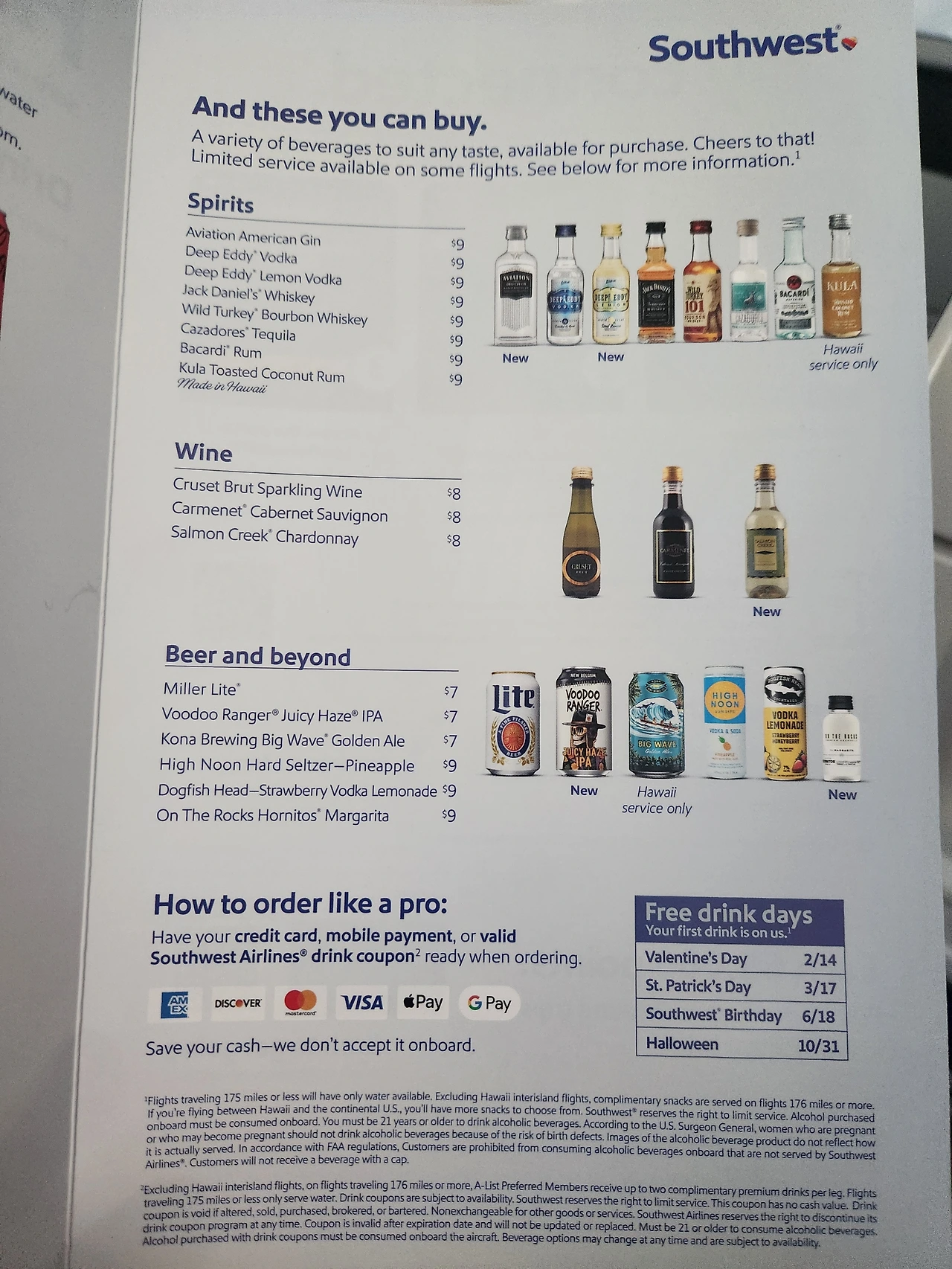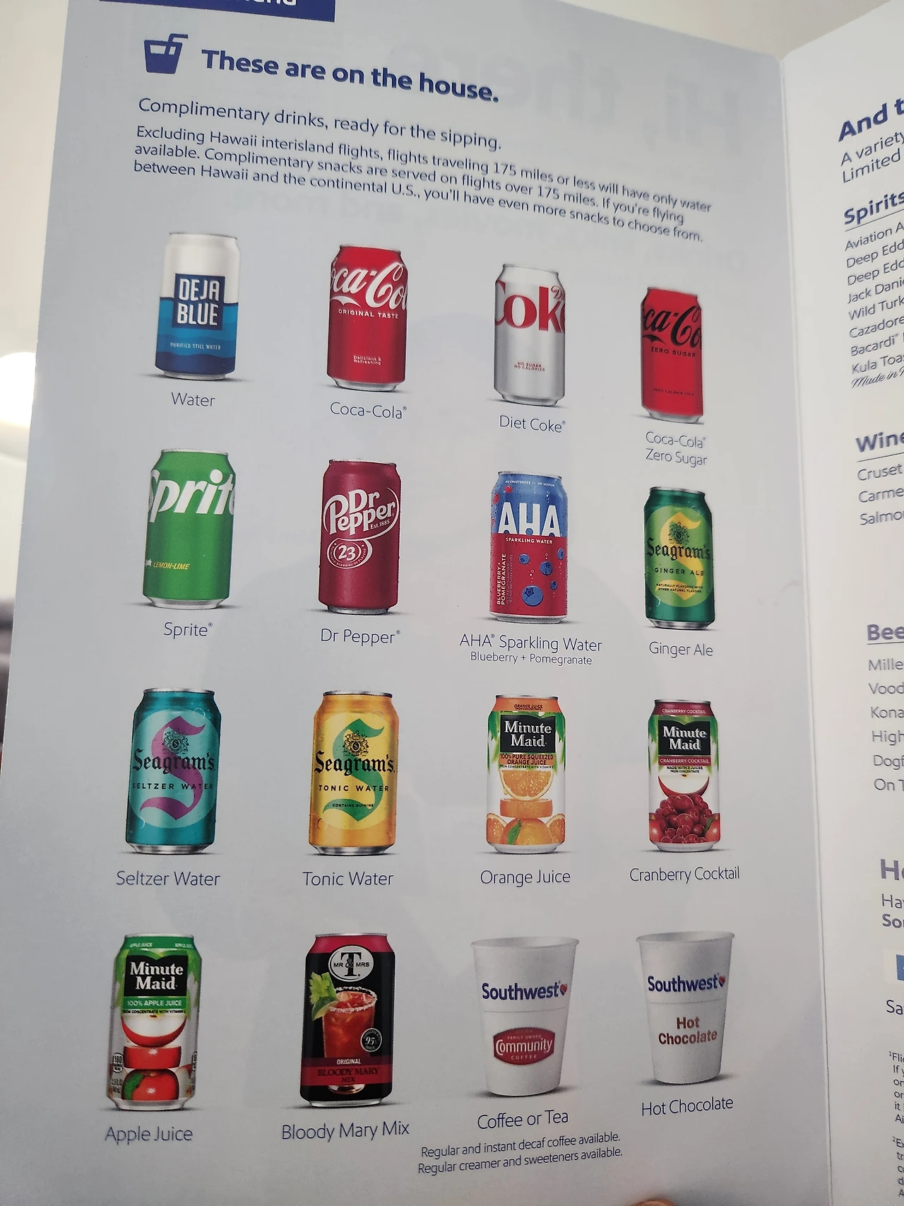 무료음료. 여러 가지 다양한 음료캔이 무료로 제공되나 잠을 자느라 그냥 패스했다. 나중에 커피 한잔, 코크 한잔 달라고 해서 마셨다. 종이컵도 두껍고 고급졌다. Spirits, wine, beer는 돈을 내고 사 먹어야 한다.