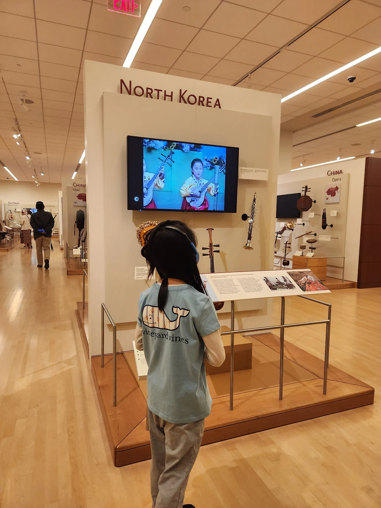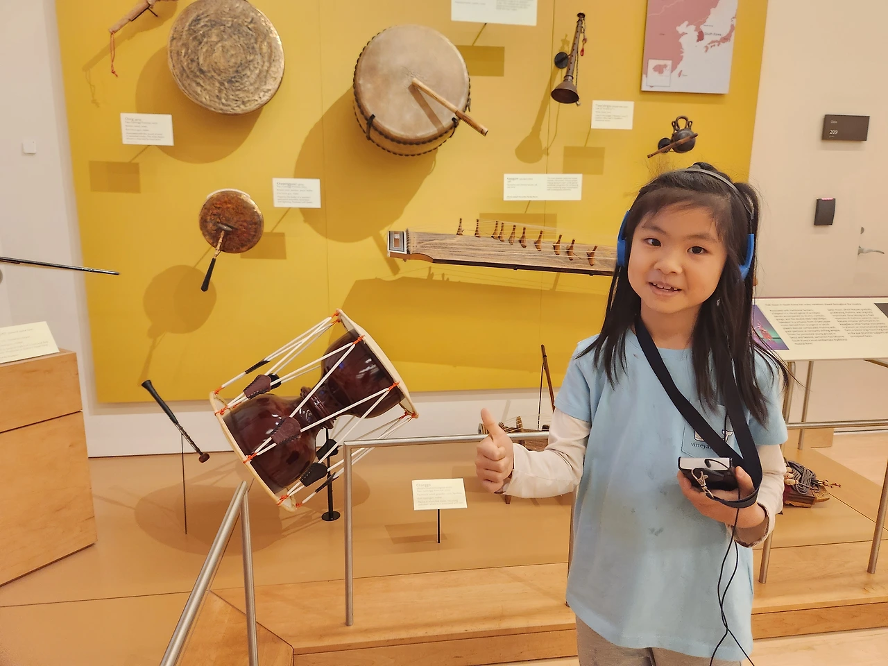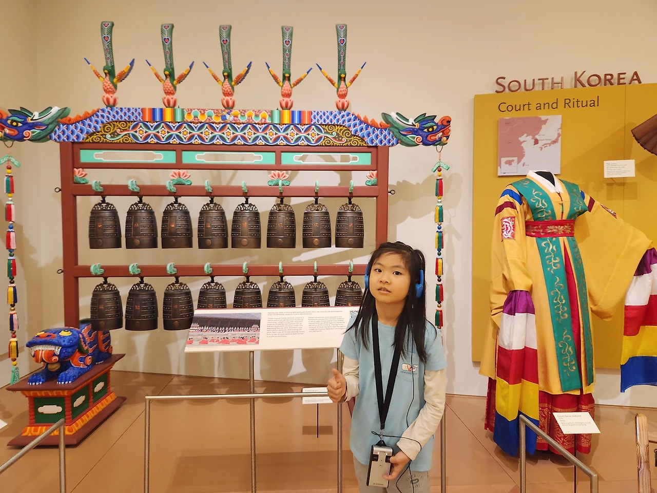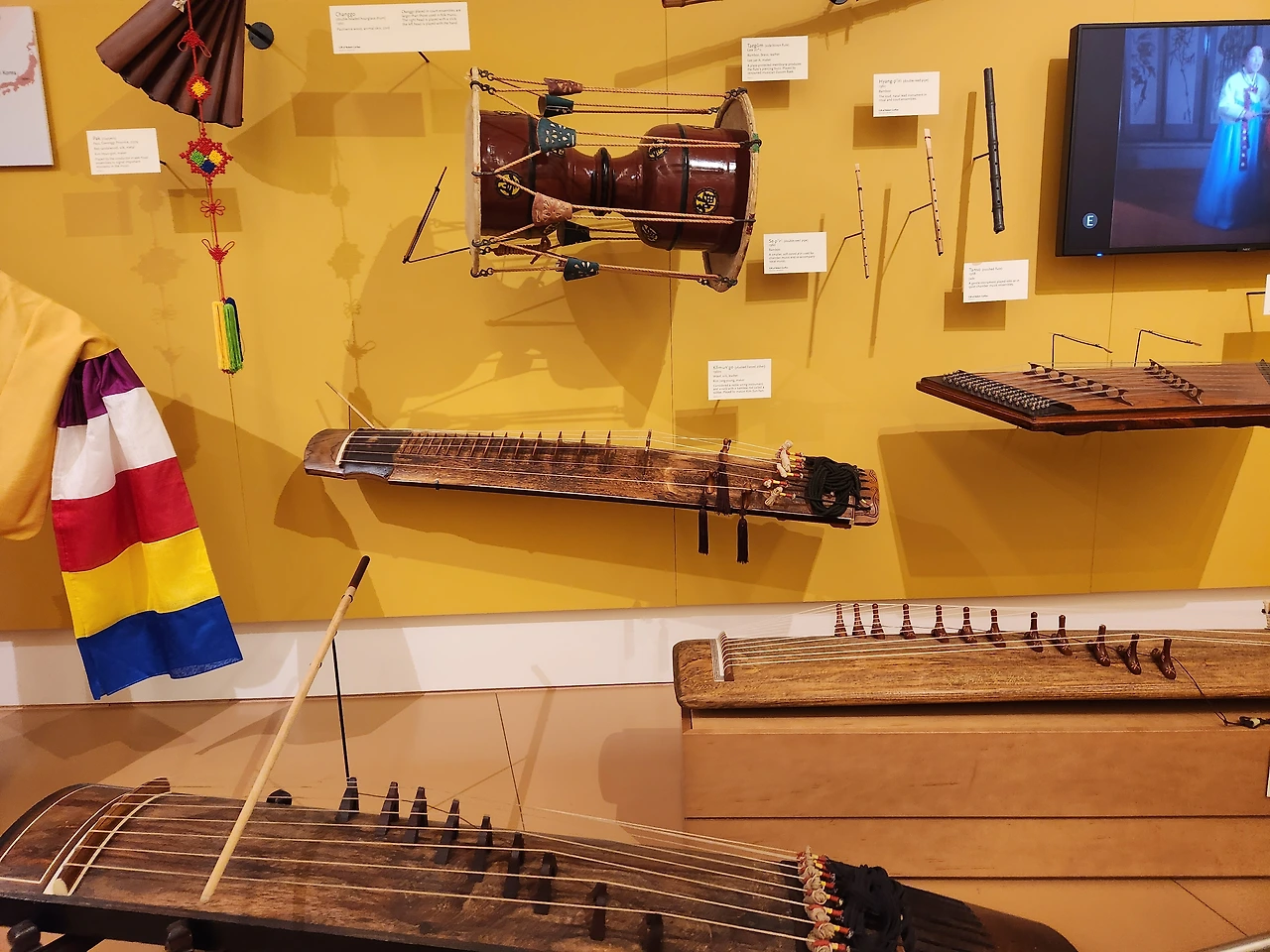 무엇보다도 south korea섹션에서 아이가 가장 좋아했다. 집에 있는 장구, 대금 등이 보였고 피리, 향피리, 해금, 가야금, 북, 꽹과리등 거의 모든 게 전시되어 있었다. 아무 생각 없이 갔는데 전통악기들을 마주 하니 고향친구를 만난 듯 기뻤다.
