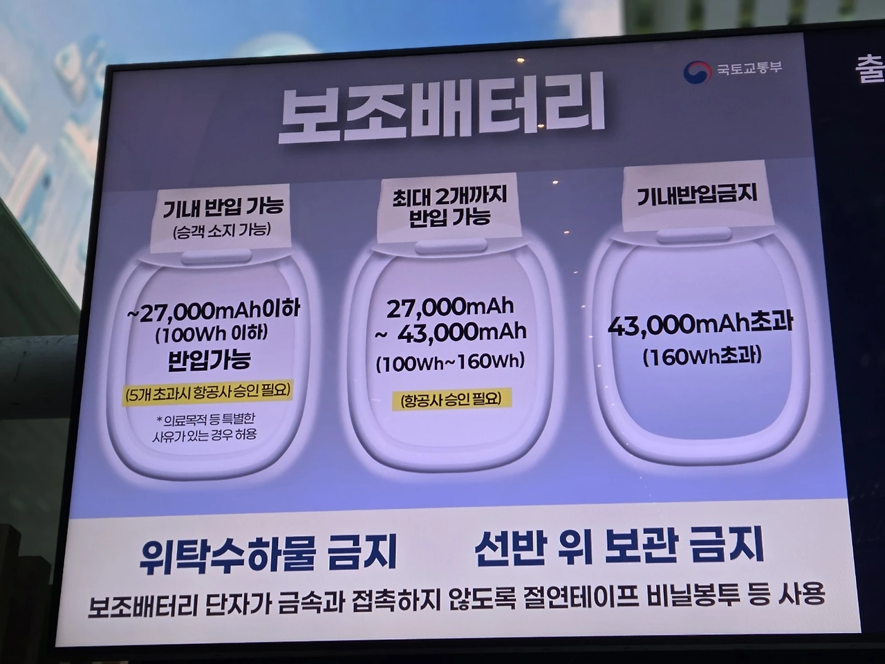 요즘 인천공항 3층 출국장 F에서는 셀프로 짐을 부칠 수 있다. 대부분 탑승 24시간 전에 모바일 체크인을 하고 티켓도 미리 받는 추세라, 이런 셀프 짐 부치기 서비스가 정말 유용해 보인다. 또, 최근 보조배터리 사고가 많아지면서 2025년 3월 1일부터는 보조배터리를 반드시 투명 비닐팩에 담아야 한다는 새로운 규정도 생겼다.