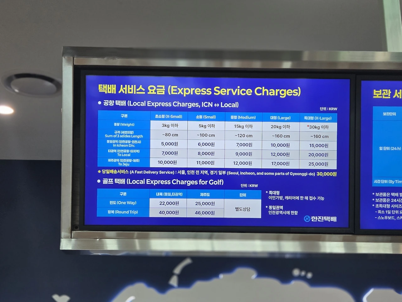 한편 대전에서 한진택배홈피의 공항택배를 이용하면 미리 짐을 이곳 공항으로 보낼 수 있다. 세 변의 합이 160cm인 특대형 박스를 다섯 개쯤 사서 대전에 내려가야 할 것 같다. 만약 23일 수요일에 출국한다면, 전주 금요일에 맞춰 짐을 보내는 것이 좋다고 한다. 참고로 인천공항 내 한진택배는 24시간 운영한다고 하니 이용에 참고하면 좋겠다.