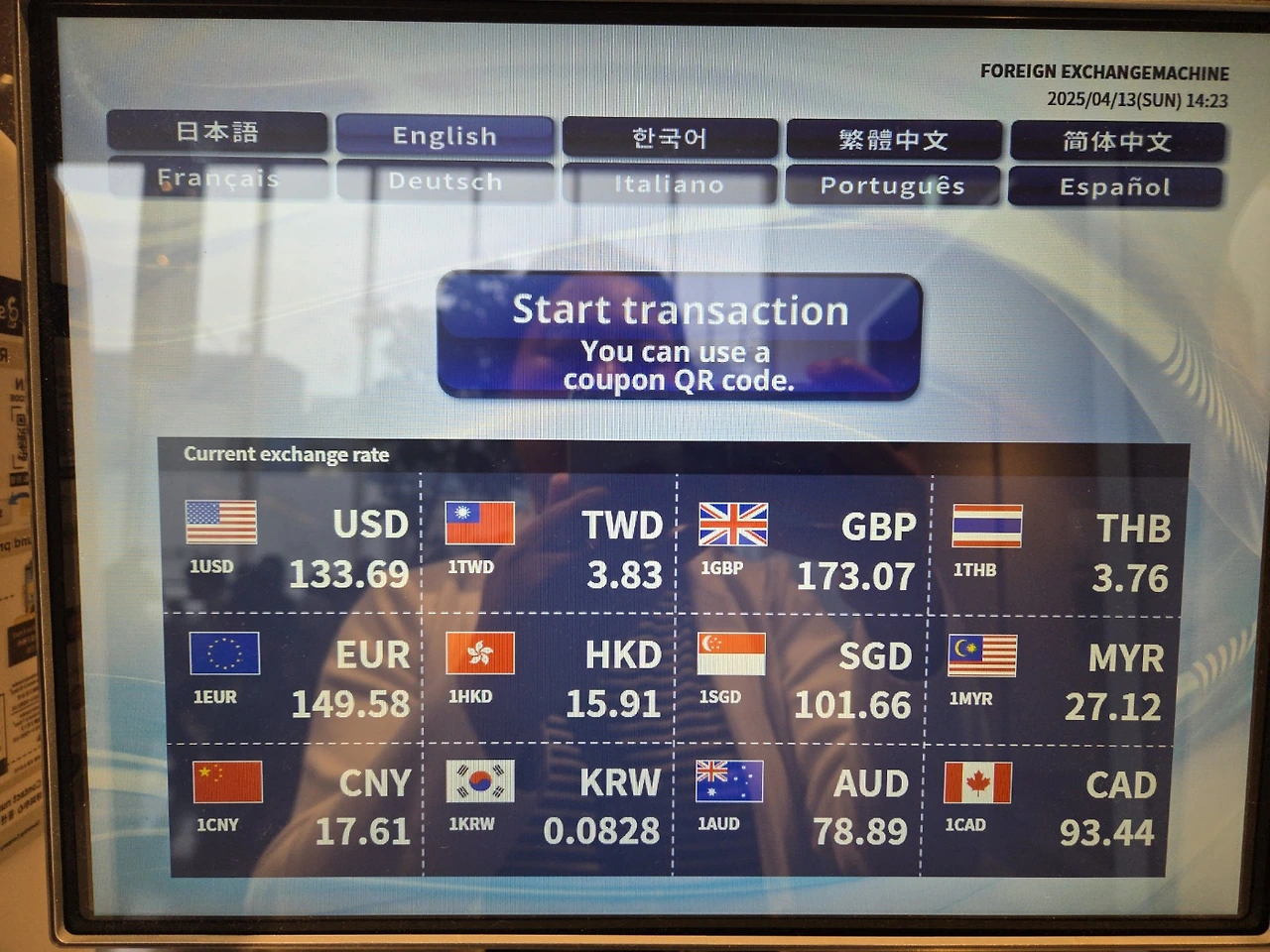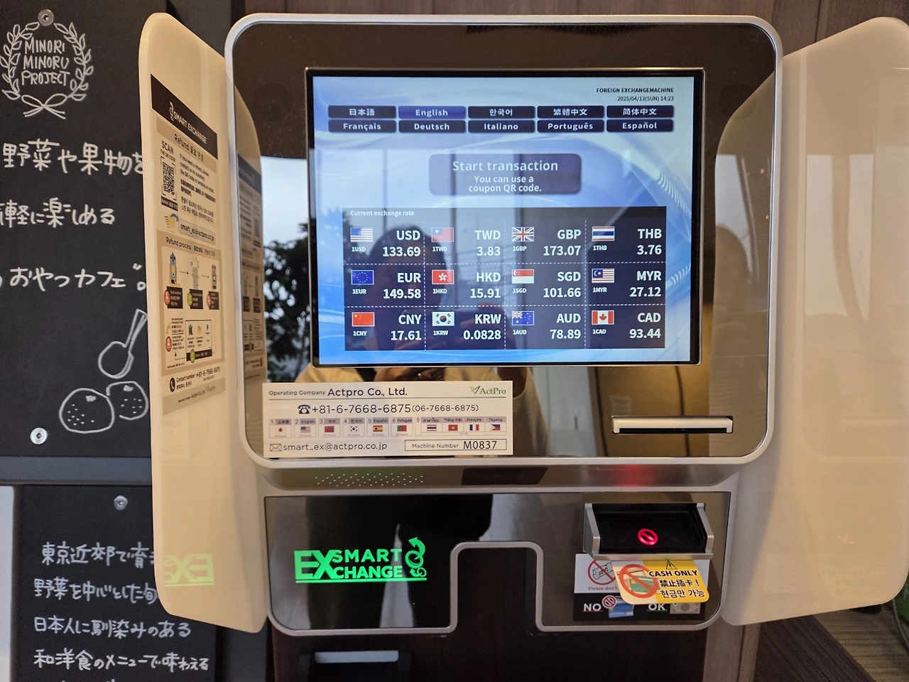 예전엔 일본에서 한국 돈을 바꾸는 게 어렵거나 불가능했지만, 요즘은 한국 돈을 일본 엔으로 바꿀 수 있는 자판기도 생겼고 환전소에서도 가능해진 듯하다.