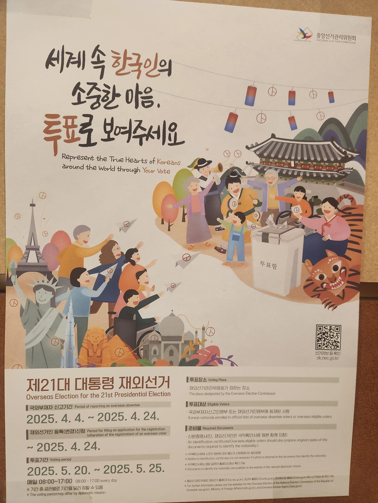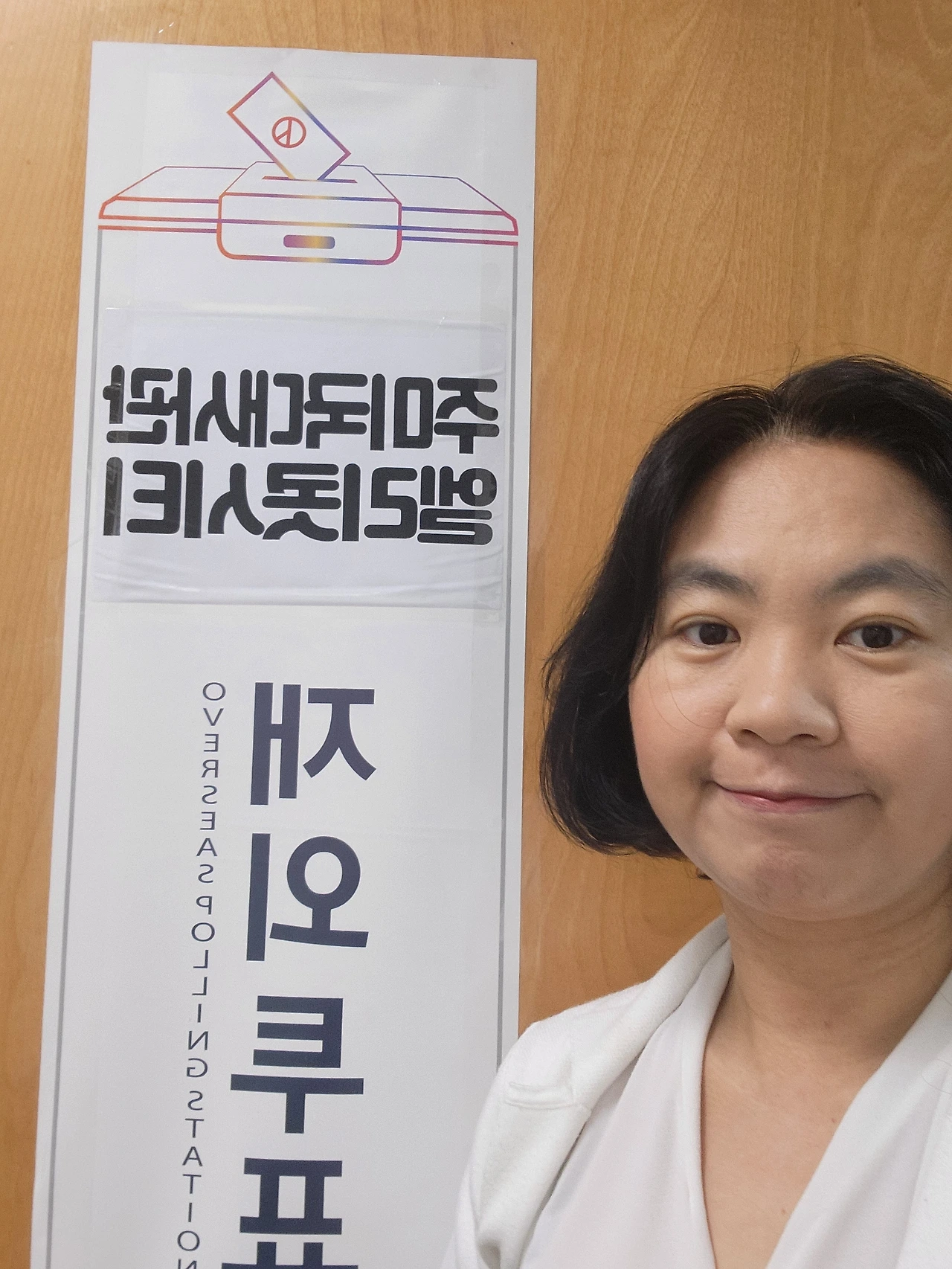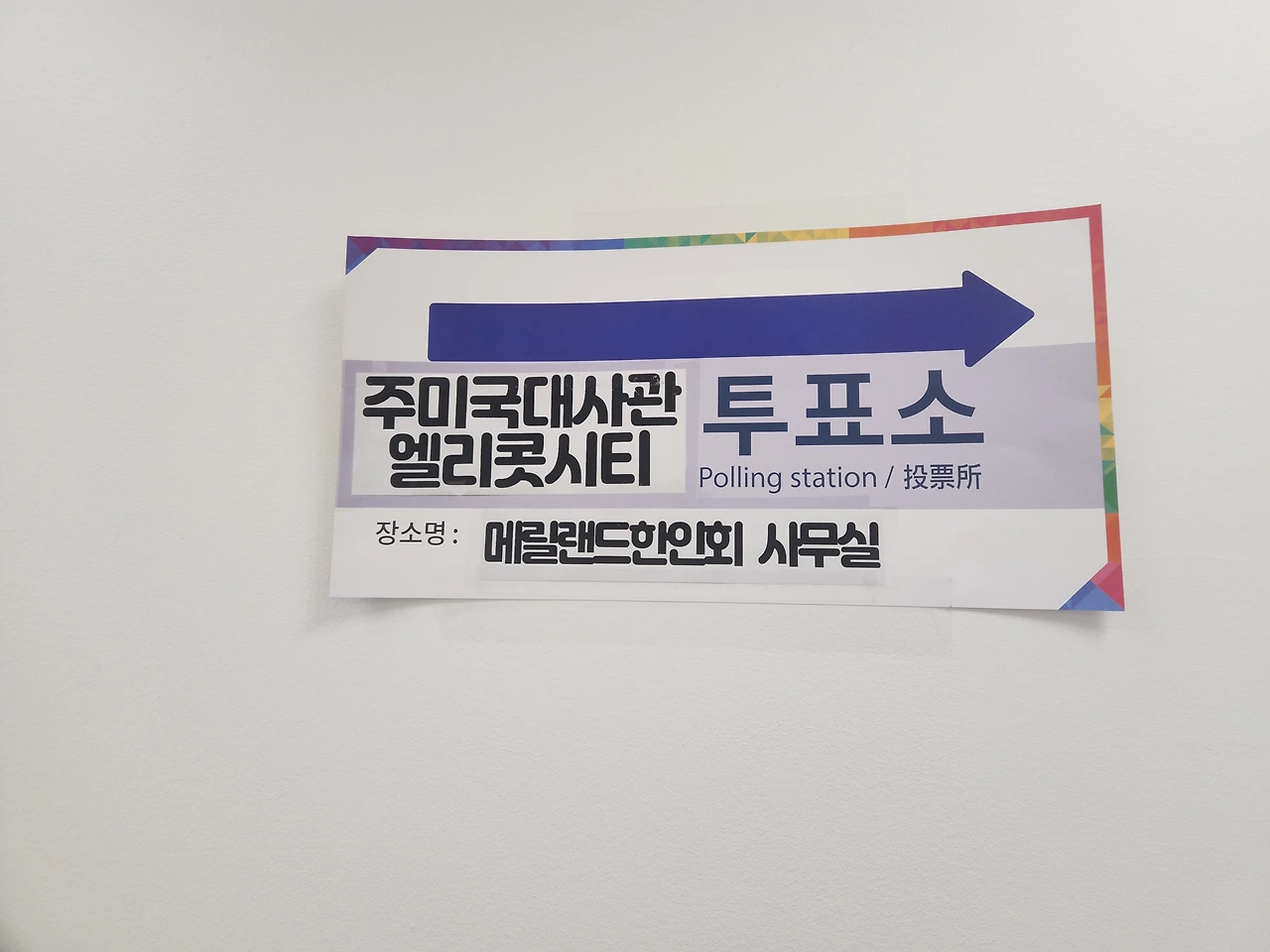 이번 주 목요일부터 토요일까지 사흘 동안, 우리 집에서 차로 10분 거리인 엘리콧시티에 마련된 재외투표소에서 투표를 하고 왔다. 현장에는 안내나 진행을 도우시는 분들이 5명 이상 계셨지만, 투표하러 온 사람은 거의 없었다. 나는 오전 9시가 조금 넘은 시간에 남편과 함께 방문했는데, 그 시간에 투표한 사람은 우리 둘뿐이었다. 더 많은 분들이 소중한 한 표를 행사하셨으면 좋겠다.