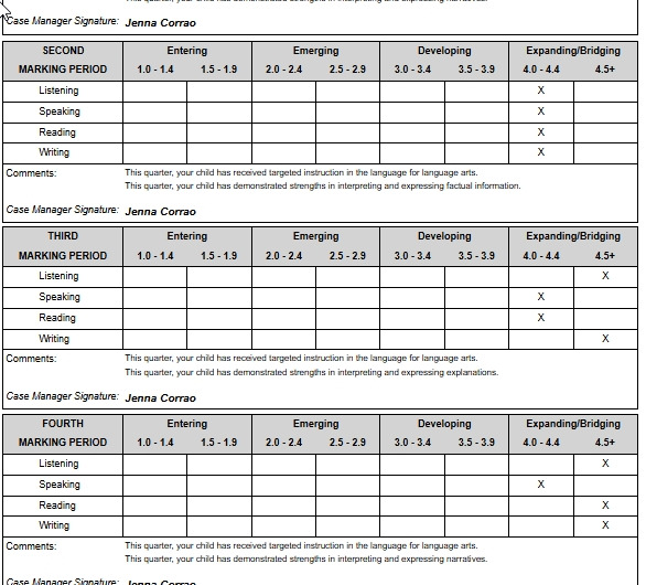 아래는 HCPSS.CONNECT에 학부모가 로그인해서 보는 화면..여기에서 ELD라는 프로그램에 가면 아래와 같은 점수가 나온다.