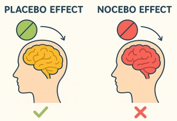 두 그룹에게 같은 가짜 알약(밀가루로 만든 약)을 주지만, 한 그룹에는 "이 약은 진통제입니다"라고 말했더니 실제로 두통이 줄어들었다는 이야기가 있다. 또한 가짜 알약을 주고 "이 약은 메스꺼움 같은 부작용이 있을 수 있습니다"라고 말했더니, 실제로 일부 참가자가 메스꺼움을 느꼈다는 이야기도 있다. 점점 좋아질 거야 하는 믿음이 실제로 호전되는 효과가 있기도 하고, 점점 나빠질 거야 하는 믿음이 실제로 상황이 악화되기도 한다.