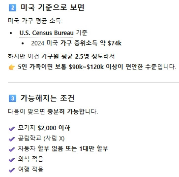 아래의 내용을 보면 모기지 2000 이하, 모두 공립학교.학교점수가 10점만점에 10점, 자동차 현금 주고 2대 구매해서 할부 없음, 외식 절대 안 함(남편의 취미는 요리) 여행은 진짜 많이 가는데, 돈이 거의 안 들게 간다.