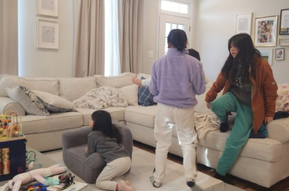 우리 교회에 아주 어린 남자꼬마(M군)가 있는데, 그 집에 놀러 오라고 하여 26일 날 세명의 딸을 대동하고 같이 갔다. 우리 집에서 15마일로 멀지 않은 거리지만, 꽤 조용한 외곽의 타운하우스였다. 오래된 집에 사는 나로서는 새로 지운 타운 하우스가 마냥 신기했다. M군은 누나들이 3명이나 와서 신이 났는지, 긴 아일랜드 식탁 주위를 계속 뛰어다녔다. 아직 말은 못 하지만, 저렇게 하는 행동이 가장 기쁠 때 하는 의미라고 한다. 누나들품에 안겨 뽀로로를 시청하는것이 신기했는지 애엄마는 자꾸 사진을 찍어댄다.