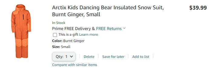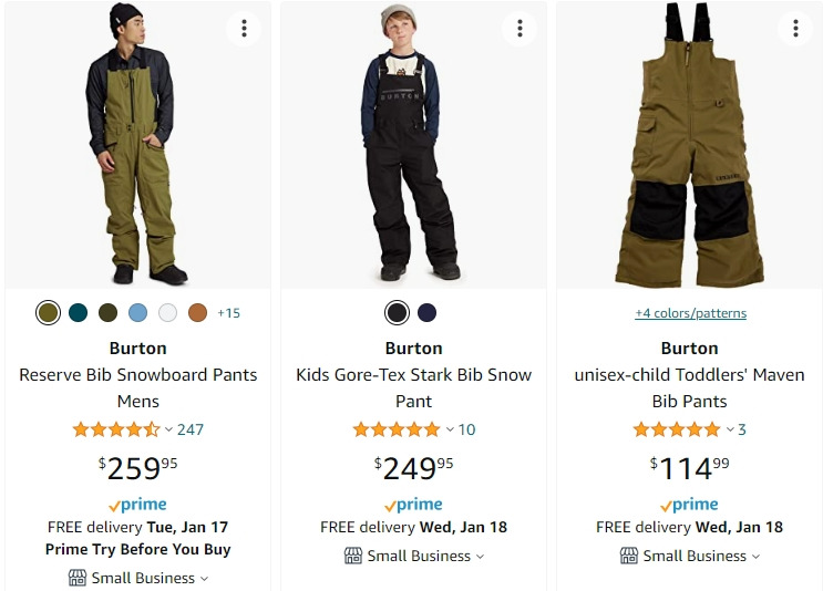 snow suit-보통 snow bib이라고 생긴 것을 이용했는데, 이번에 가서 보니 미국에서는 snow suit로 재킷과 바지가 하나로 올인원인 것을 많이 입는 것 같다. 내가 생각해도 이것이 편해 보여서 다음에 갈 때는 이걸로 하나 장만 하려 한다. burton 같은 고급 브랜드는 성인용으로 150-250불 정도 하고, 저렴한 것 특히 아무 색상이나 소화 가능하신 분은 39.99불도 나쁘지 않아 보인다.