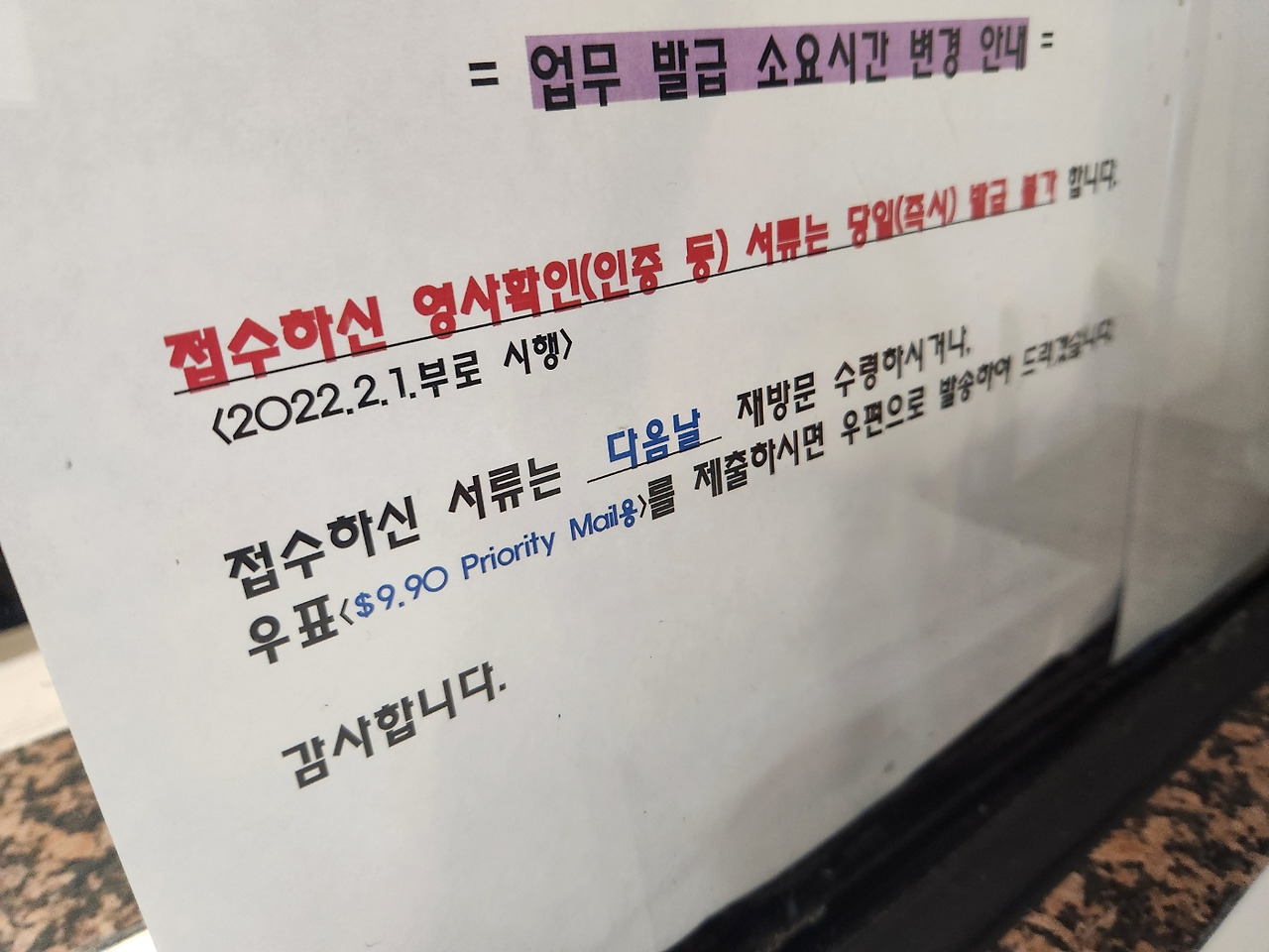 영사관 안에 사진을 찍는 부스가 있다. 인화는 되지 않고, 직원 컴퓨터로 바로 연결되어서 여권전용 사진을 만들 수 있다. 딱 1년 뒤에 남편의 여권을 갱신해야 하는데, 미리 사진을 만들어 보자고 했는데, 종이로 나오는 게 아니라 직원의 컴퓨터로 연결되는 거라 하여 그냥 왔다. 또한 여권을 수령하거나, 급히 받아야 하는 서류는 요금이 좀 비싼 EXPRESS 우표를 사야 하는데 27.9달러 정도 한다(23.1.17일 기준).