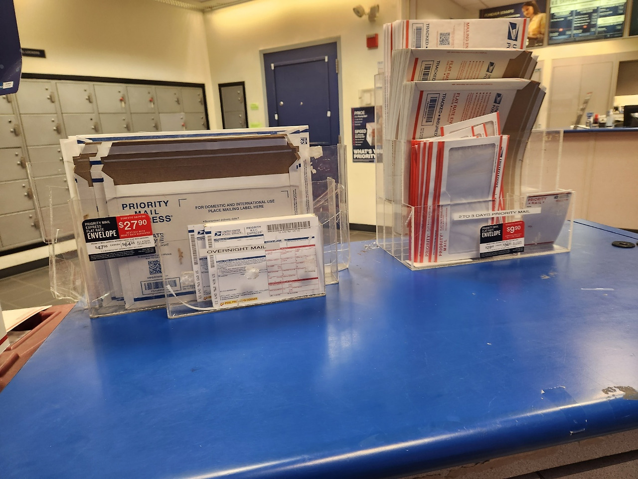 어떤 우표를 사나요? 아래 그림의 위쪽에 봉투가 있는데, 이 봉투는 일반이라 빨간색이고, 급행은 파란색이다. 암튼 9.9불 우표를 사면 된다. 작년 10월 대비 금액이 또 올라서 8.95불 우표에 오른 만큼 추가로 한 장 더 주더니 결제는 9.9불을 해준다. 미국의 우표는 스티커형식으로 되어 있다. 거기에 트래킹이 되므로 트래킹 번호가 적힌 것을 포함하여 직원에게 3장을 받는 셈이다. 다행히 우리 집 앞에 큰 우체국이 있어서 여유 있게 2회분을 사놨다. 혹시 필요한 사람이 있을지 몰라서.