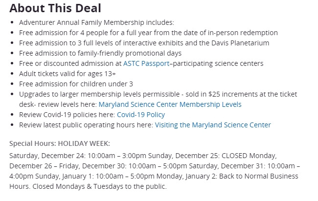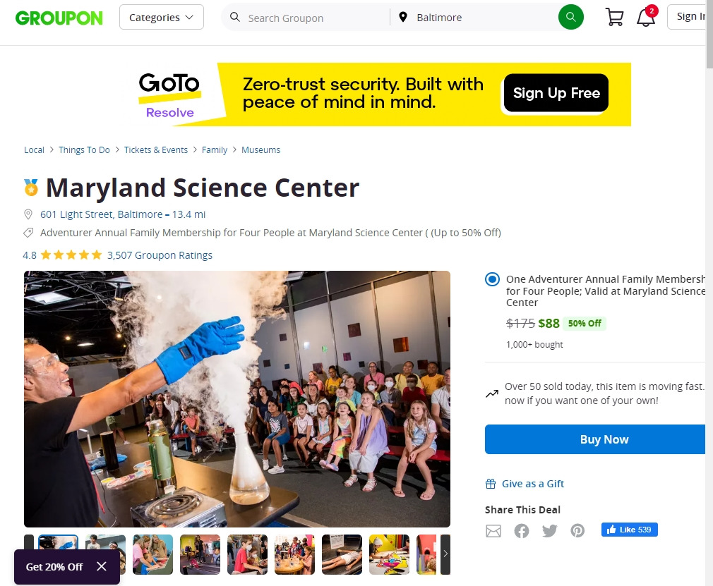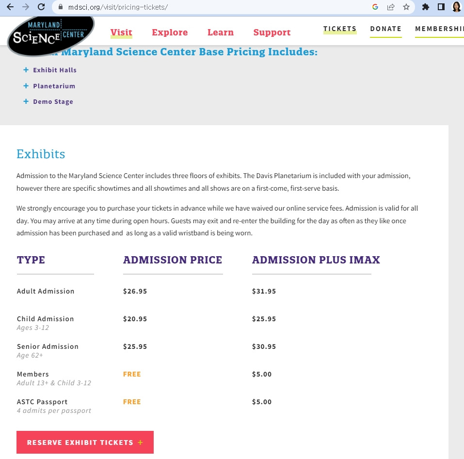 2) 미국 멤버십의 가격: 입장료가 워낙 비싸서 사실 두 번 정도 방문할 예정이면 멤버십을 그냥 사는 게 이득이다. maryland science center는 4명이서 1년 멤버십이 150불에서 175불로 올랐다. 요즘 안 오른 게 없다는 것이 여기에도 적용되더라. 보통 겨울에 www.groupon.com 사이트에 방문해 보면 이렇게 절반가격으로 멤버십을 판매하기도 한다. 이때 구매하는 것이 매우 이득이다. 꼭 여기만 방문가능한 것이 아니다.