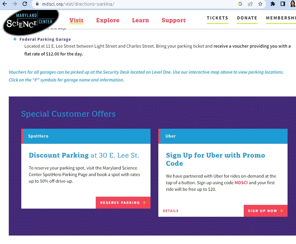 예약을 하면, 다음과 같은 이메일을 받게 된다. 바코드가 표기된 것을 프린트해서 가거나 핸드폰으로 보여주면 된다. 여기에서 중요한 것은 과학관의 주소를 찍고 가면 안 된다. 과학관에 주차할 장소를 내비에 찍고 가야 한다. 홈페이지에서 VISIT-DIRECTIONS로 가면 파킹정보가 뜬다. SPOTHERO에 할인된 가격으로 주차가 가능하다. 보통 20불 내야 하는 주차비를 평일에는 8.44불에 갈 수 있다. 미국은 어딜 가나 항상 주차장을 찍고 가는 습관이 생겼다. 대전중앙과학관의 드넓은 주차장이 그립구먼.