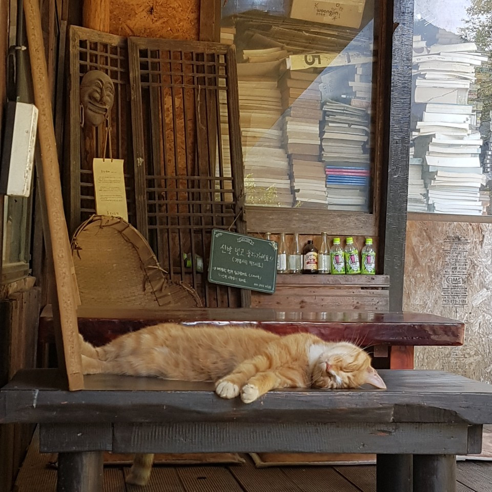 검은 털에 군데군데 염색을 한 것처럼 빛바랜 노란 털을 입은 묘(猫) 집사가 서가를 감시하듯 어슬렁 거렸고, 울퉁불퉁한 흙바닥에 천정 높이까지 쌓인 헌책들 사이를 오가며 사진도 찍었다. 서가에 빼곡한 책 제목들이 자기를 뽑내 듯 제각각의 크기와 높낮이로 선택을 기다리는 그곳 분위기에 압도되었다. 나의 부질없는 글쓰기도 다시 한번 생각했다. 이렇게 많은 것들 속에 제목도 다 읽지 못하고 보내야 하는데 소설 한 줄처럼 '나까지 보태지 않아도' 되는데 하는 생각이 들었다.