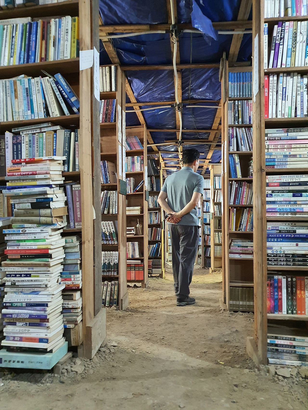 비스듬한 경사에 위에서 내려다 보이는 책방 통로는 영국 왕립도서관 부럽지 않은 풍경이었다. 헌책 특유의 냄새가 후각을 자극했다. 좋았다. 흙바닥이라 울퉁불퉁했지만 물이 흘러 들어온 흔적은 보이지 않았다. 꽤 많은 책들이 가지런히 혹은 무더기로 쌓여 있었다. 통로 쪽 책꽂이에는 작은 종이로 세계문학, 한국문학, 시험 서적, 학습지, 만화 등 분류표시가 되어 있었다. 책 모양을 갖춘 것들은 다 있는 듯했다.
