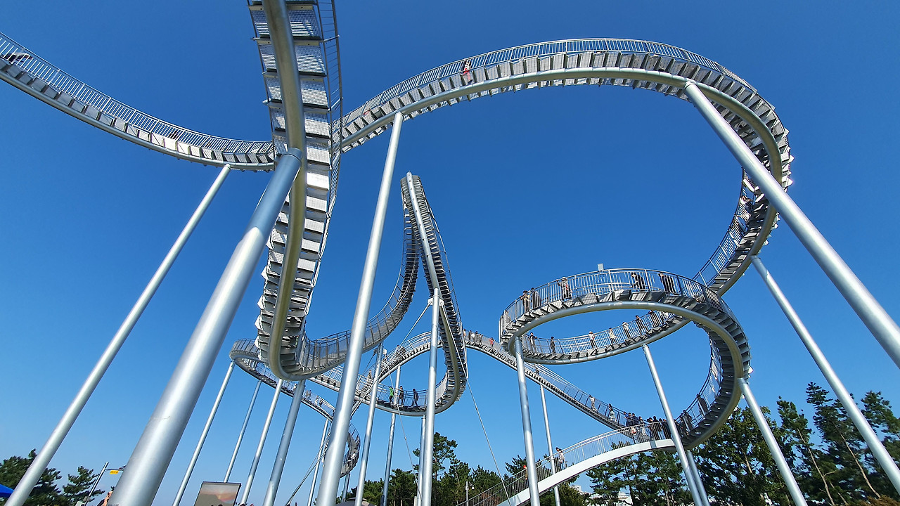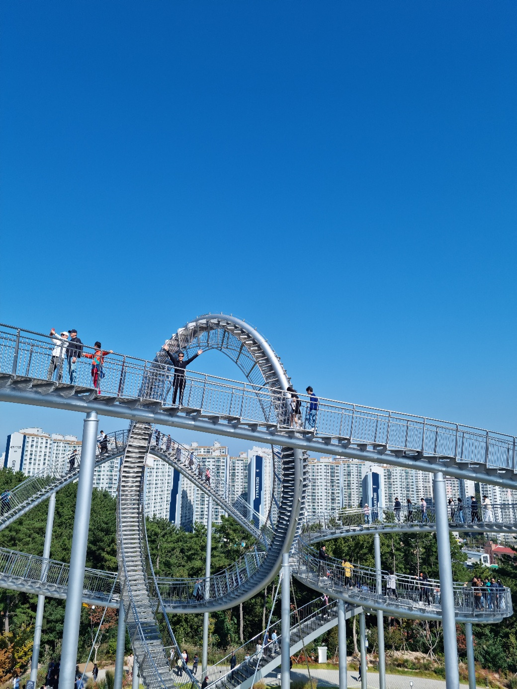 그런데 포항 스카이워크에서 제일 가파른 첫 고개를 오를 때 온몸으로 느껴지던 진동과 고소에 대한 공포감을 극복하고 나니 다른 오르막에선 면역이 작동했는지 두려움이 덜어졌다. 꽉 잡은 손잡이 쇠에서 전해지는 진동에서 알 수 없는 단단함에 믿음이 생겨났다.