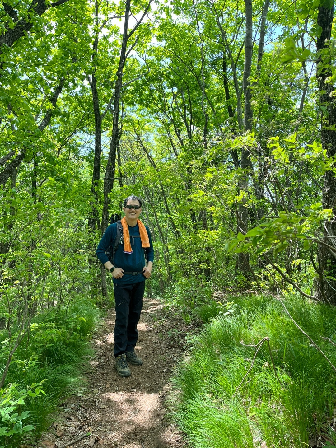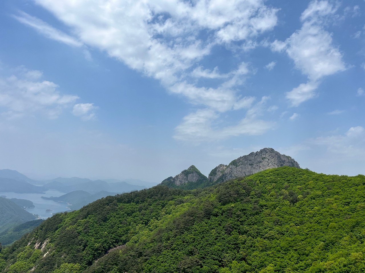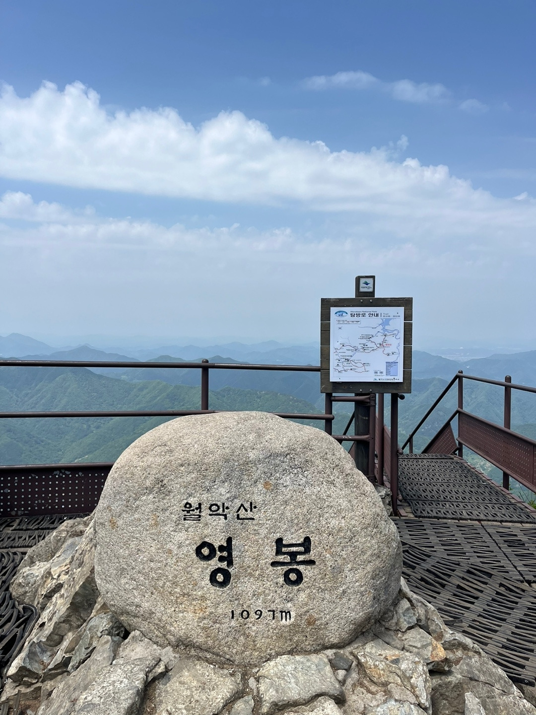 신록이 울울창창한 숲 길에서 뫼비우스띠에 갇힌 것처럼 반복되는 계단을 오르다 보니 나무 사이로 옅은 하늘이 언듯 언 듯 보여 능선이나 봉우리에 다다른 조짐이 나타났다.