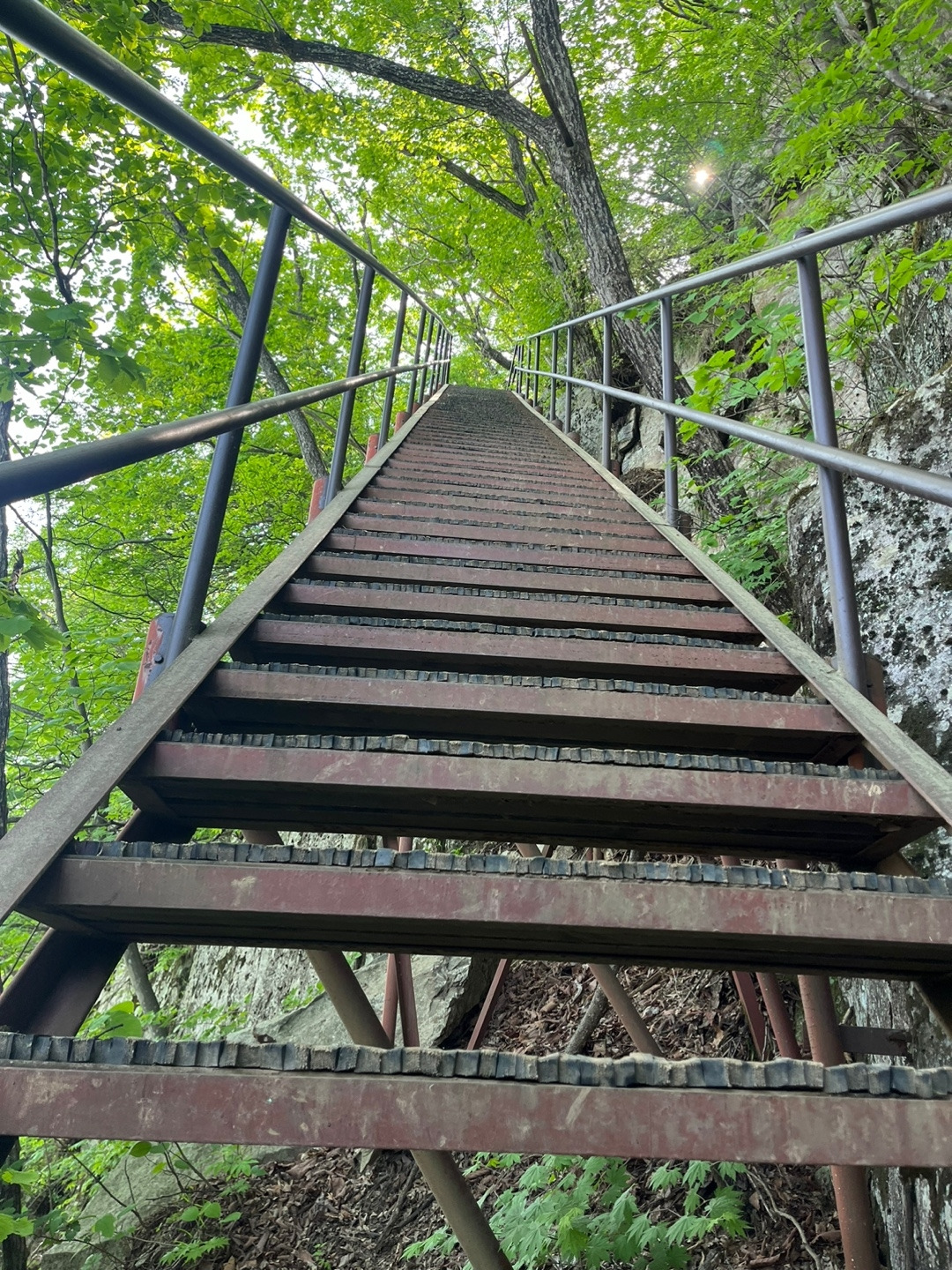 오죽하면 같이 간 친구에게 부처님 오신 날에 이렇게 자비가 1도 없는 무자비한 등산은 처음이라고 말했다. 사실 나는 오르막을 오르는 길을 택하라면 주저 없이 계단을 선택한다. 왜냐하면 뭘 붙잡고, 어디로 발 디딜까? 스틱은 어디를 짚을까 고민하지 않고 터벅터벅 한 계단씩 발을 옮기면 10-20cm씩 고도를 올려주는 편리한 장치가 아닌가. 게다가 하체운동 삼아 스쿼드나 계단 오르기 헬스기구의 5-6 정도의 스피드로 1천 개 정도를 15분 남짓만에 오를 정도로 운동을 했기 때문에 계단이 아니라 사다리도 자신 있었다.