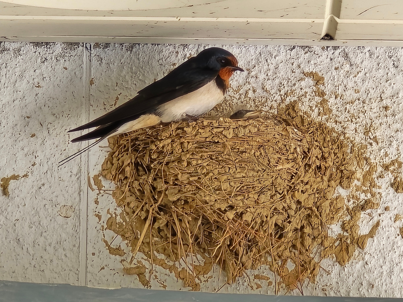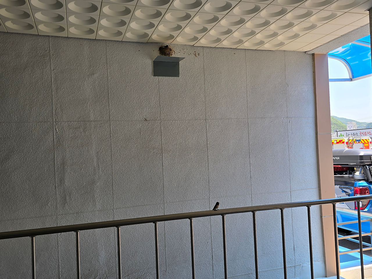식당 앞 지하실 입구 계단 위 처마 끝. 흰 페인트로 깨끗하게 단장된 벽이 제비의 보금자리로 선택되어 흙이 묻혀지기 시작했다. 매 끼니때마다 직원들이 분주하게 드나드는 곳을 선택한 이유가 천적으로부터 안전한 곳이라고 제비는 판단한 듯했다. 제비는 왜 사람이 천적이 될 수도 있다는 생각은 안 했을까? 제비에게는 흥부의 DNA만 있어 사람들이 자기들에게 해를 끼치지 않고, 보호해 줄 거라는 확신만 있는 걸까?