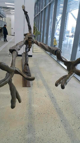쇠로 된 ‘미스터 리’는 아주 날씬한 남성이 뒷발을 높이 쳐들고 앞 발은 앞 꿈치로 딛고 선 채 손을 자기 몸보다 한 2미터는 앞으로 뻗어 뭔가를 잡으려고 하는 모션을 취하고 있었다. 얼마나 간절한지 팔을 길게 늘어 표현했고, 모든 신체구조에서 손이 제일 컸다. 세상의 모든 것을 잡을 수 있을 만큼 비율적으로 크게. 두 팔에 묻힌 얼굴은 작았고, 곱슬머리에 오만상을 찌푸린 듯했지만 간절함이 절절하게 묻어났다.