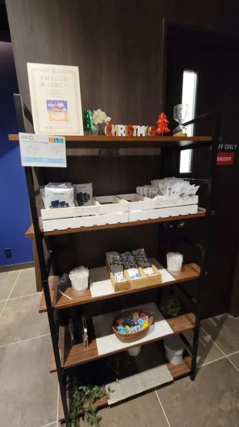 객실 내 비치품 외에 필요한 세면도구를 1층 로비에서 셀프로 가져가는 시스템이었습니다. 프런트 옆에 준비된 스탠드에 칫솔, 면도기, 빗, 샤워타월 등 일회용품이 쭉 놓여 있으니 필요한 만큼 챙겨 올라가면 됩니다.