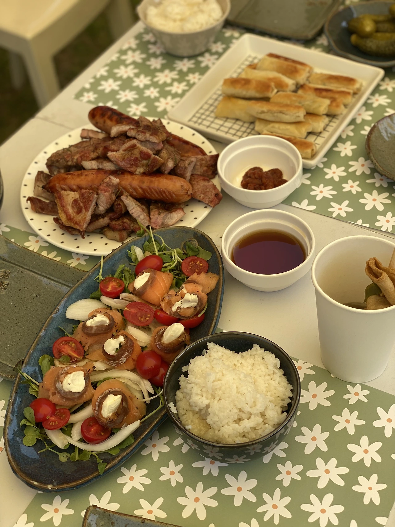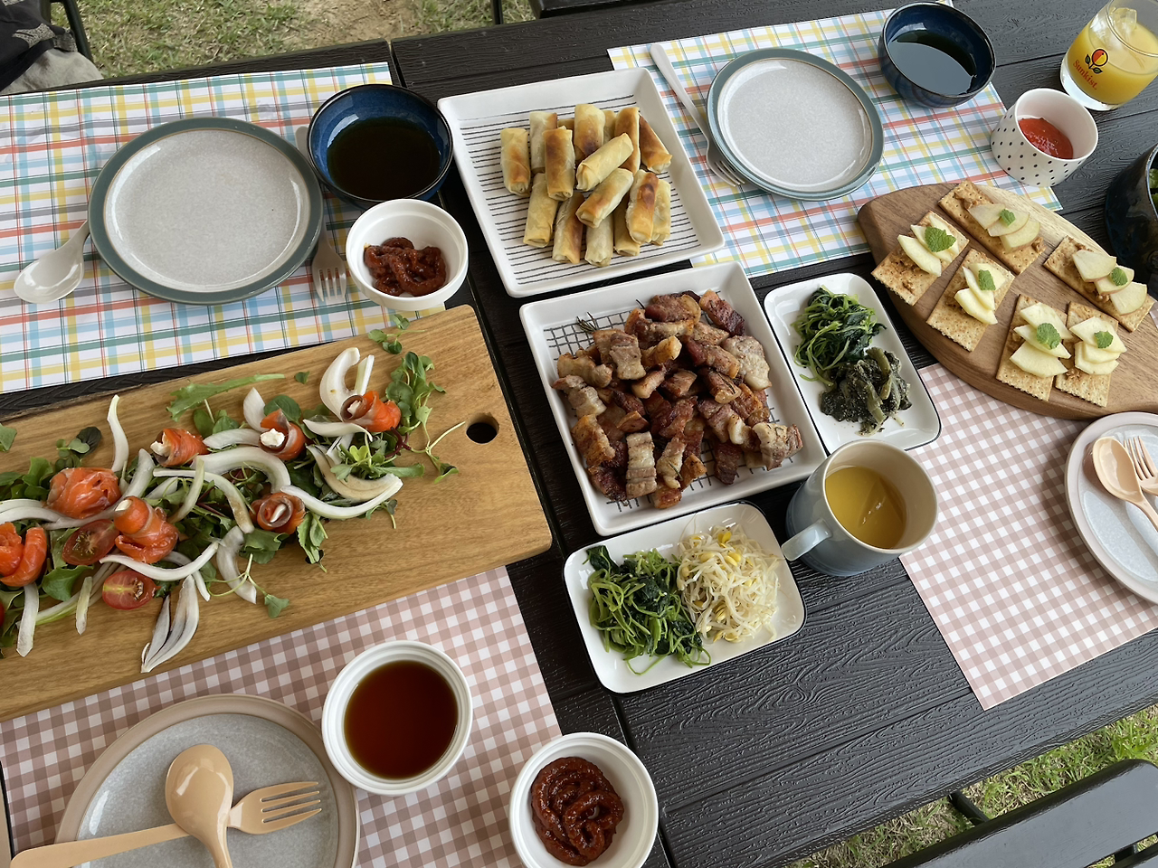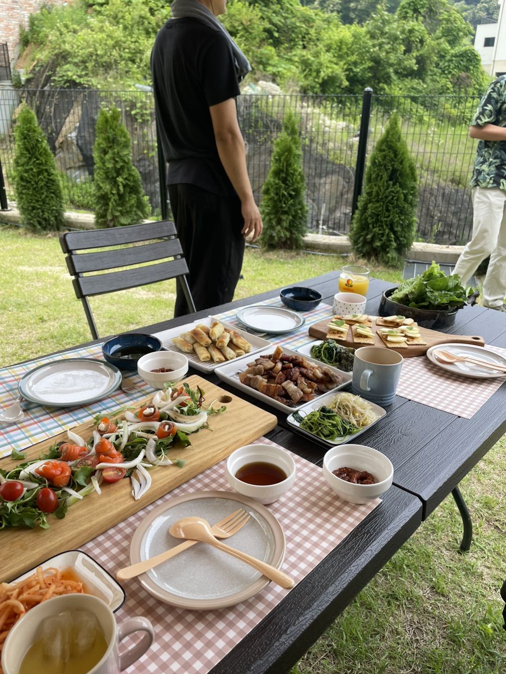 물론 훈제 삼겹살, 목살이 메인이지만 이건 남편의 영역이고 나의 메인은 훈제연어말이나, 계절 반찬, 쌈무 말이 등