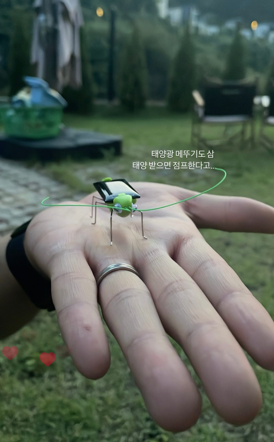 그리고 아이 장난감으로 귀여울 거 같이 샀다는 태양열 메뚜기. 부엉이,...