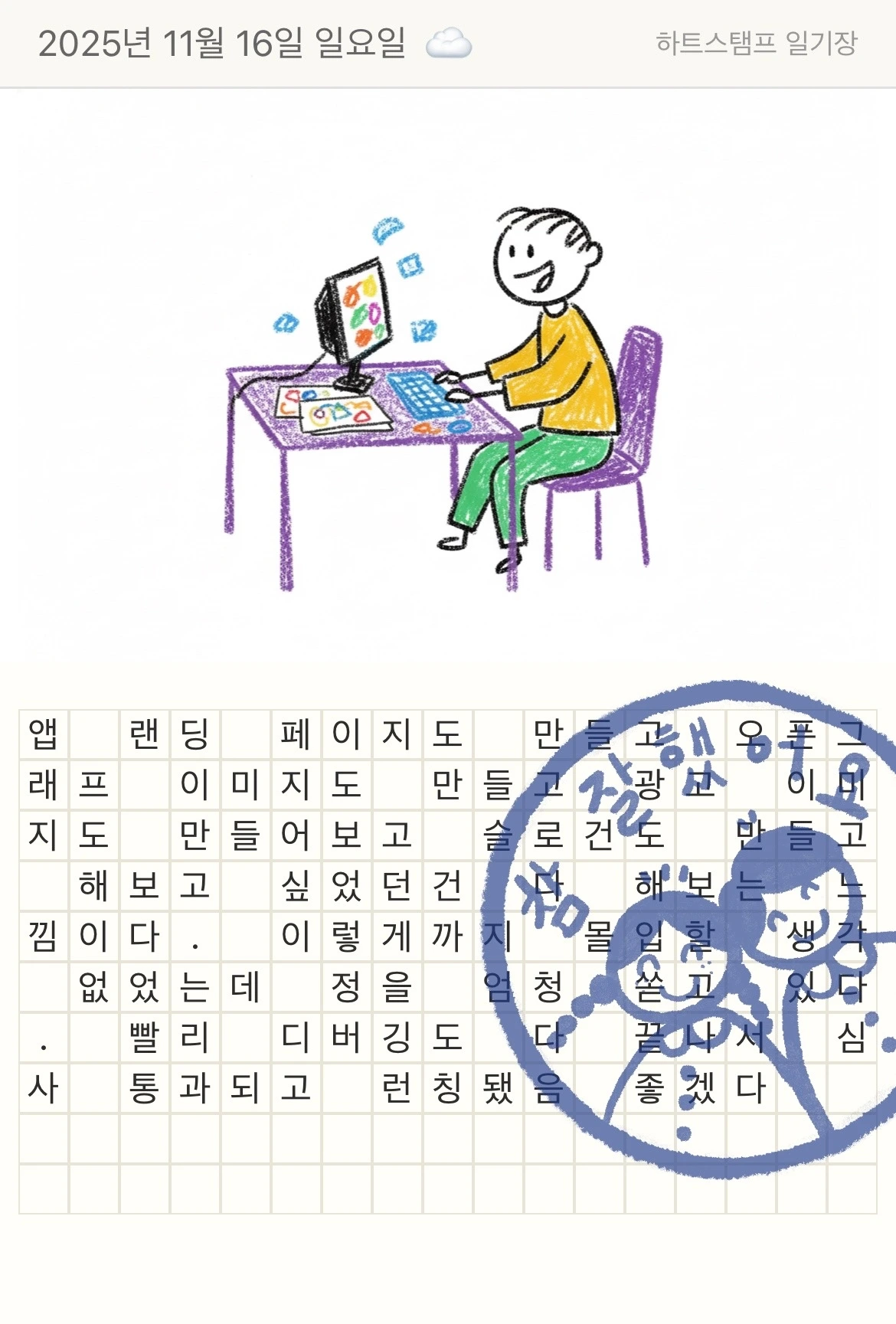 일기를 쓰고 자면 다음 날 새벽, 어린시절 담임 선생님의 일기 검사처럼 코멘트와 칭찬 도장이 도착하는 앱이다.