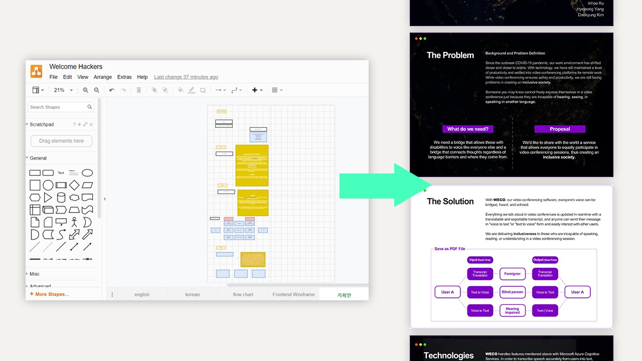 그와 동시에 아이디어 회의가 시작됐고, 우리는 draw.io를 메인으로 아이디어 빌드업을 했다. 외국인과 함께하고 있었기에 메인을 영어로 두고 나처럼 영어를 완벽하게 이해하지 못하는 팀원을 위해 한국어 섹션을 따로 만들어서 영어로 쓰인 내용을 번역하여 실시간으로 공유했다.