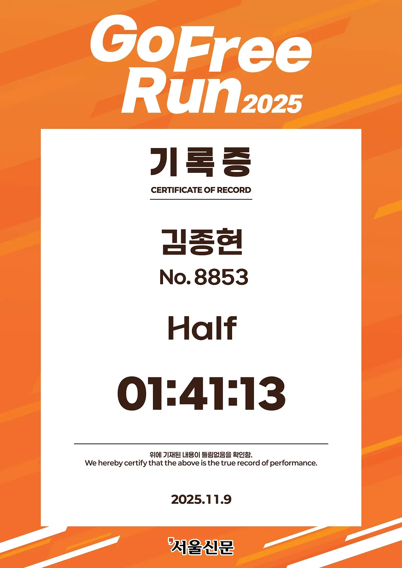 11월에 고프리런 2025 하프마라톤에서 1시간 41분 13초