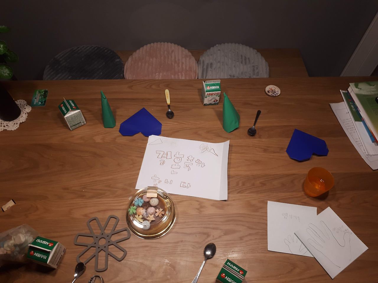 다음 날, 아침 일찍 아이들이 부산스럽게 돌아다닌다. 새벽이면 슬그머니 일어나 우리 부부가 자는 침실로 들어와 우리 사이에 파고들어 잠이 드는 아들 둘이 자기네끼리 신이 났다. 아들이 깨워 나가 보니 식탁에 케이크와 함께 편지와 색종이로 접은 하트가 놓여있다. 식탁이 뭔가 허전하지만 자기네끼리 얼마나 설레어하며 준비했을까 생각하니 마음 한 구석이 찡해온다.