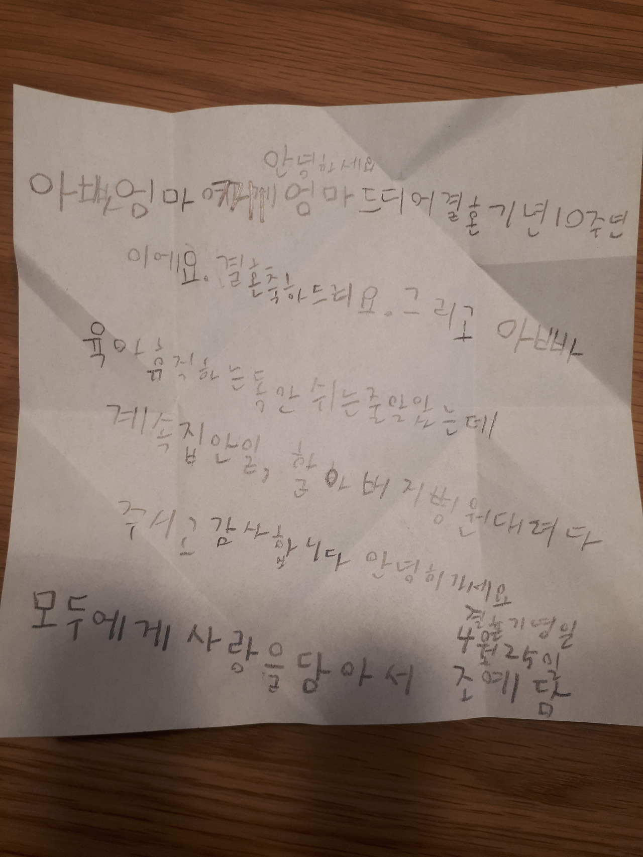 그렇다. 올 해는 특별히 우리 부부가 결혼한 지 10년째 되는 해였다. 예담이에게 들어보니 내가 사회인 야구를 하러 간 날 아이들을 재우면서 얘기해줬다고 했다. 예담이가 아니었으면 잊고 지나갈 뻔했다. 이벤트에 크게 신경 쓰지 않는 부부라 그냥 “올 해가 부부로 산 지 10년째네.”하고 넘어갔을 텐데. 감성이 충만한 예담이에겐 나름 특별했나 보다. 자기 용돈을 다 털어 케이크를 산 걸 보니 말이다.