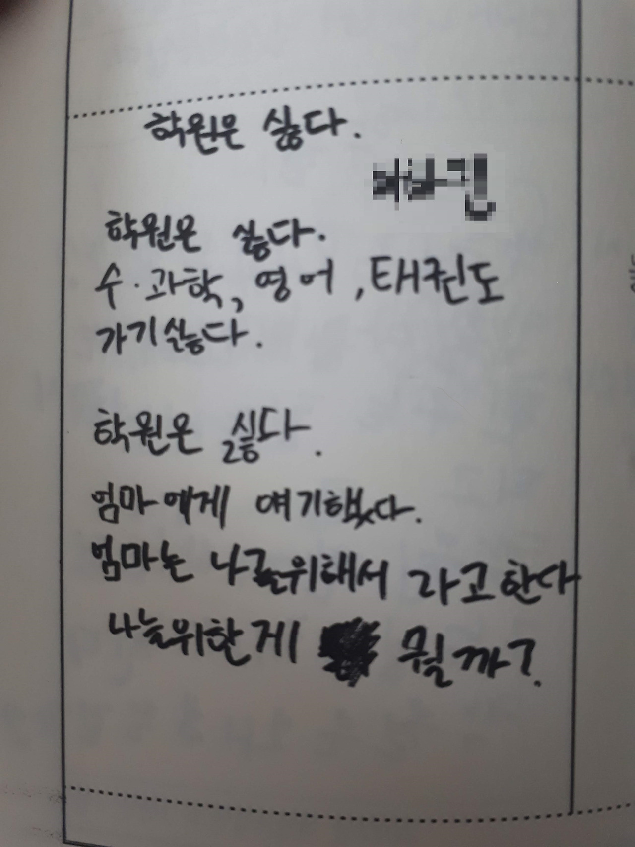 시를 배우는 수업 시간에 한 아이가 쓴 시. 정말 아이를 위한 게 뭘까?나는 아들은 이런 삶으로 내몰고 싶지 않다. 그냥 지금을 즐기게 하고 싶다. 공부를 시켜야 한다면 학원 말고 스스로 복습하는 시간만 최소한으로 가지게 지도해야 한다고 생각한다.