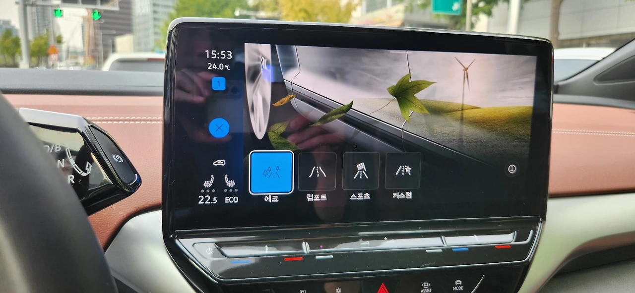 대시보드 중앙에는 12인치 터치스크린이 들어가 있다. 화면 자체의 선명도가 우수하면서도 시야 교란이 없다. 제스처 컨트롤이 가능하지만 터치 감도가 좋아 굳이 쓸 일은 없다. 기름기가 있는 간식을 먹을 때는 유용할 듯.