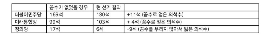 둘째로, 꼼수가 없었을 경우의 가상의 결과를 살펴보자. 더불어민주당과 미래통합당이 위성정당 없이 비례대표에 나섰을 때의 시나리오에 새로 도입된 준연동형 비례대표제의 계산 방식을 그대로 적용하여 결과를 산출해보았다. 더불어민주당의 경우 지역구 의석수 163석에 비례대표 의석수 6석을 더한 총 169석을 얻게 된다. 미래통합당은 지역구 84석에 비례대표 15석을 더한 99석을 얻게 된다. 정의당은 지역구 1석에 비례대표 16석을 더한 17석을 얻는다. 꼼수가 없었을 시의 가상의 결과를 현 선거 결과와 비교한 표는 아래와 같다.