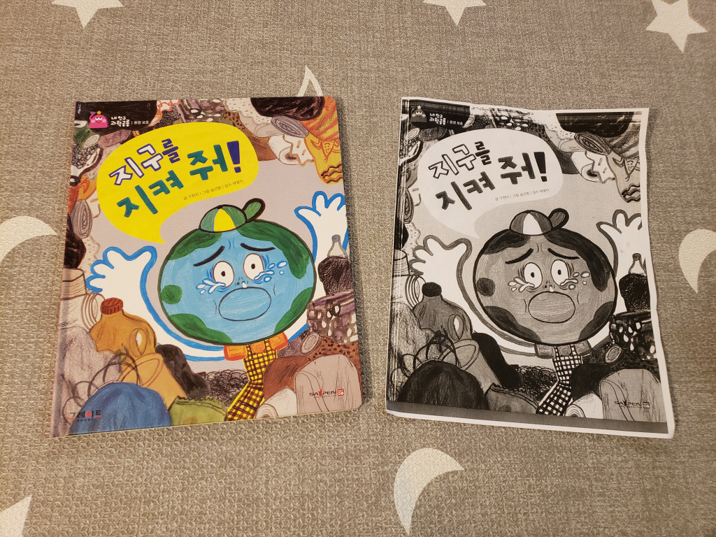 최근에는 내친구 과학공룡의 '지구를 지켜 줘!' 책을 들고가곤 했는데 오늘 아이의 사물함에서 이 종이를 발견했다. 선생님께 여쭤보니 환경 오염에 대해 배울 때 책을 다같이 본 후 이 책의 표지를 복사해서 아이들에게 나눠주고 색칠하는 놀이를 했다는 것이다. 어쩌다 보니 햇님이의 책 덕에 아이들의 사물함에는 한국어가 적힌 종이들이 차곡차곡 쌓여가고 있다. 햇님이 반 스무명 남짓의 아이들 중에 부모 중 하나가 한국인인 친구가 두어명 있지만 모두 다 한국어를 사용하진 않는다. 그러니까 한국어를 하는 아이는 햇님이 한명 뿐인 셈인데, 당당하게 한글 책들을 가져가며 나름 영향력을 발휘하고 자기가 책 내용을 이야기해 주고 한국어도 종종 가르쳐 준다니 너무 대견하고 기특했다.