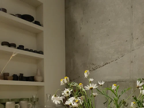 그리고 탄탄한 소재와 작은 디테일들이 있는 옷, 잘 짜여진 장 안에 가득 놓여진 와인잔과 기물들, 단순한 형태의 화병과 도자기 까지, 차와 직접적인 관련이 없는 물건들이 자신들의 자리를 편안히 지키고있다. 마치 '티 컬렉티브의 차를 마시는 사람은 이런 라이프스타일을 갖고있어'라고 말하는 듯 하다.