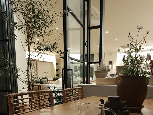 티컬렉티브는 오히려 반대 느낌이다. 따뜻한 날씨의 어느 유럽 휴양지의 좋은 리조트 안에 있는듯한 느낌이다. 오래된 나무테이블, 흰벽 마감에 모던한 블랙 프레임 도어, 화이트 패브릭 소파, 키 큰 올리브 나무까지. 이 곳에서는 전통차 위주로 판매하지만 지루하고 고리타분하게 느껴지는게 아니라 멋있고 세련된 느낌을 준다. 여기가 한옥 카페였다면 그저그런 인스타용 카페가 되었을지 모른다. 그러나 한국 전통차와 유럽풍의 공간이라는 상반된 조합이 티컬렉티브만의 브랜드 철학을 받쳐주고있다.