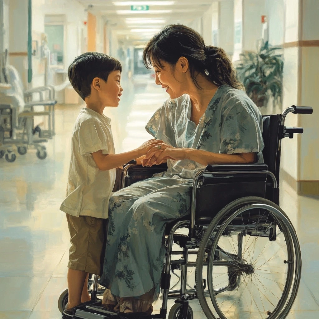 주말이 되어 남편과 가족들이 다 같이 면회를 오겠다고 했다. 엄마, 아빠, 남편 그리고 4살인 첫째까지 함께 온다고 했다. 편도 2시간이 되는 거리인데 내 얼굴을 보러 와준다고 하니 온다는 소식을 듣자마자 며칠 전부터 설렜다. 토요일 아침, 간병인 이모님과 우여곡절 끝에 목욕재계까지 하고 가족들이 오기를 두근두근한 마음으로 기다렸다. 점심때쯤 마침내 병원에 도착했다는 전화를 받았다. 그런데 코로나 때문에 면회하러 병실에 들어올 수 없다고 했고, 내가 1층에 내려가야만 모두를 만날 수 있다고 했다. 몸이 불편해서 버틸 수 있을까 걱정이 됐지만, 일단 휠체어를 타고 1층 로비로 내려갔다. 내가 등장하자 모두가 반가워하는 동시에 안타까움과 측은함이 담긴 눈빛을 하고 있었다. 아이는 엄마의 낯선 모습에 약간 놀란 듯했고, 집에서 나온 지 2주 정도 되었을 뿐인데 데면데면하게 대했다. 아이 아빠가 시켜서 첫째가 날 안아주었다. 아이를 안자마자 마음 깊은 곳에 숨어있던 그리움이 터져 나오며 순식간에 눈시울이 붉어졌다. 너무나도 보고 싶었다. 그리웠다. 내 사랑들이.