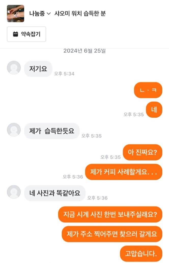 엥? '당근'은 중고거래 app이 아닌가? 누가 '당근'에서 분실광고를 보고 주인에게 연락을 준다는 말인가. 모래사장에서 바늘 찾기와 다를 바 없었다. 하지만 그것 외에는 다른 선택지가 있는가?! 밑져야 본전이란 생각으로 전화기 사진첩을 열어 손이 찍힌 사진 한 장을 찾아냈다. 워치가 잘 보이게 손목을 줌인하여 편집했다. 흰 프레임에 보라색 플라스틱 밴드가 연결된 샤오미 워치.