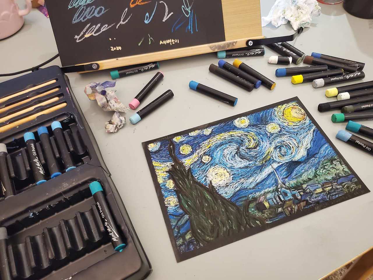 음악을 스피커에 연결했다. 서랍 속에 포장지채로 들어있던 오일파스텔을 꺼내 천공의 무한한 별들을 상상했다. 화려한 은하수와 별 빛 안의 어둠과 희망을 보며 별 속에 빨려 들어가는 나를 그대로 내버려 두었다.